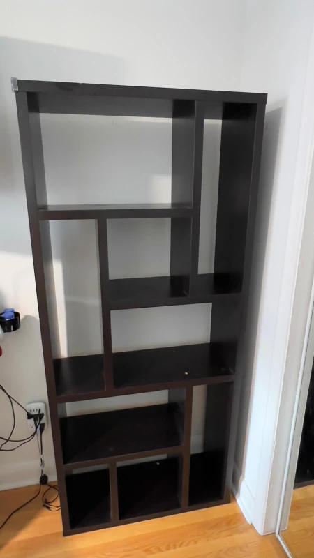 Selling a dark brown geometric shelving unit. It's in great shape and perfect for adding a modern touch to any room. It can be used vertically or horizontally to suit your space and style