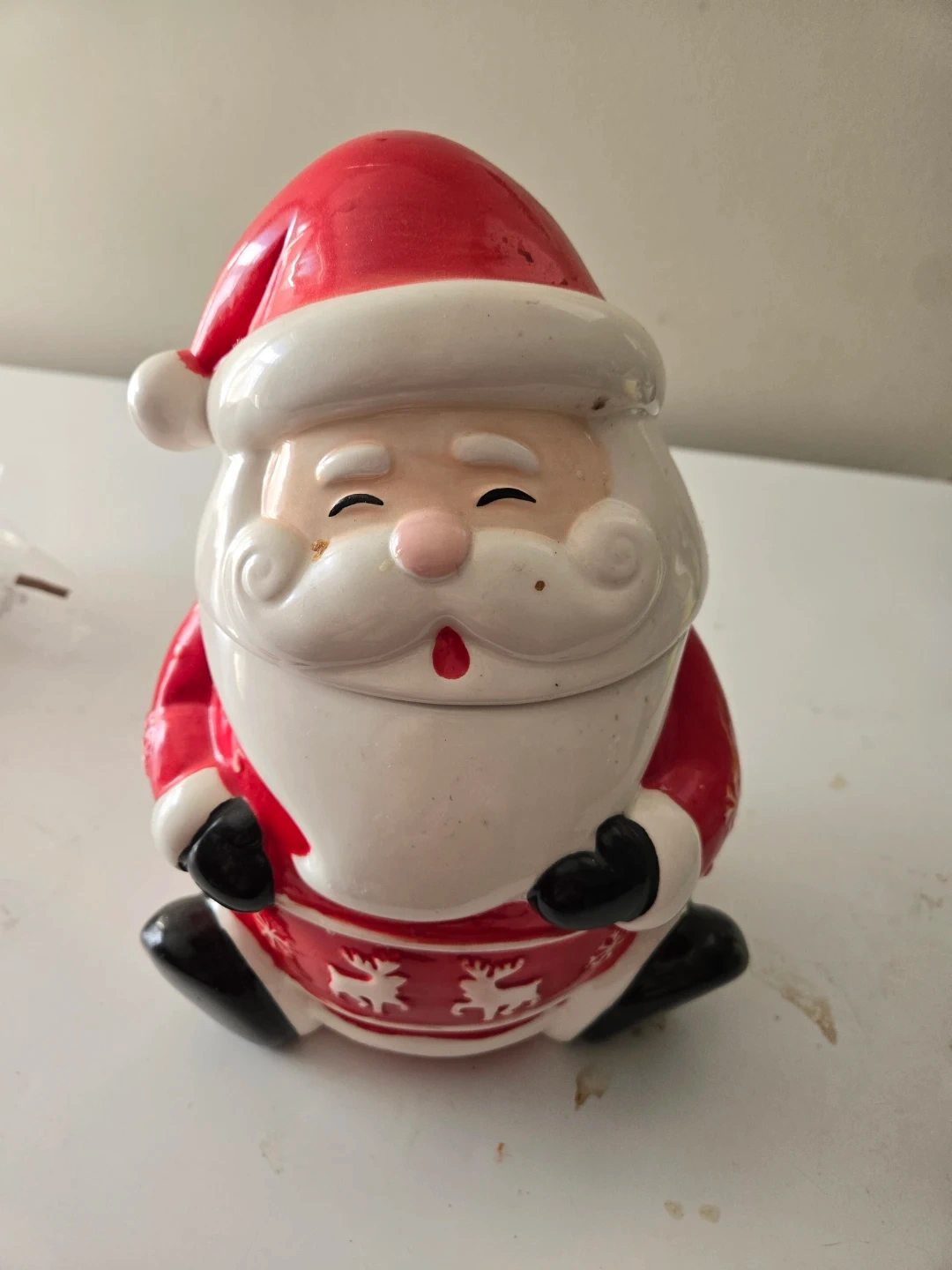 Here’s a cute Santa cookie jar for your holiday treats! It features a classic Santa design with a red hat and cheerful face. Perfect for adding some festive cheer to your kitchen or as a gift for someone special.