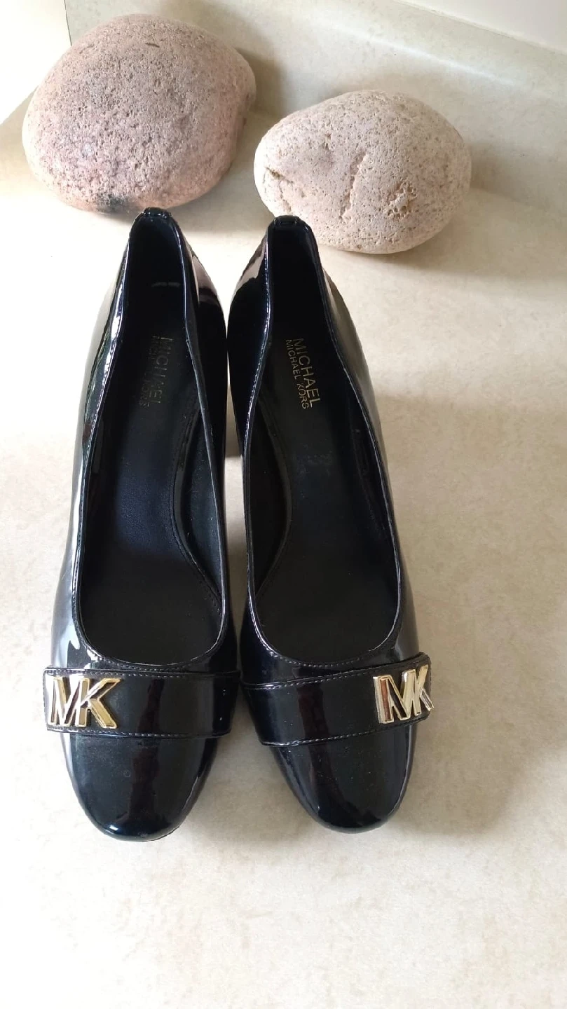 These are a pair of Michael Kors black patent leather pumps in a size 8. They feature the MK logo on the front. These shoes are perfect for adding a touch of elegance to any outfit. They show some signs of wear but are still in good condition and ready for a new home!