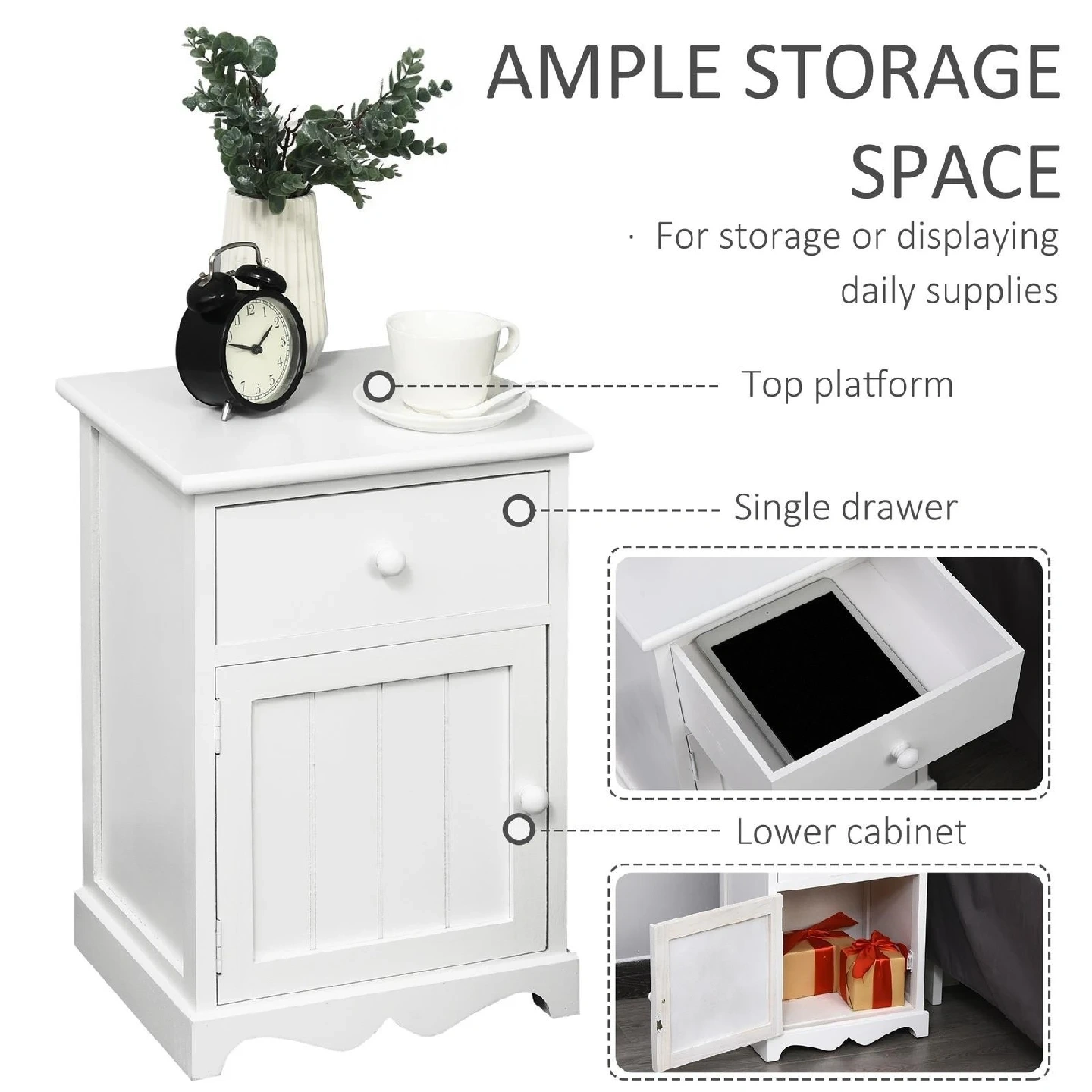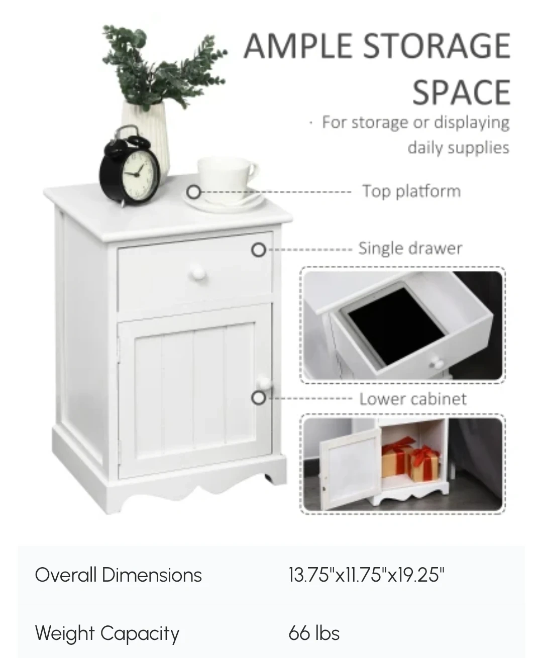 Selling a set of 2 cute white nightstand! It has a top platform, a single drawer, and a lower cabinet for ample storage space. Overall dimensions are 13.75" x 11.75" x 19.25".