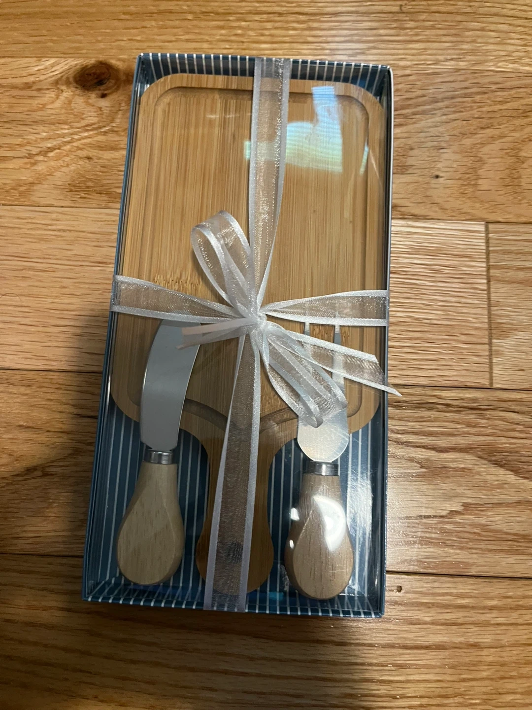 I have a brand new cheese board and knife set still in its original packaging. It includes a small wooden cheese board and two cheese knives with wooden handles. Perfect for entertaining!
