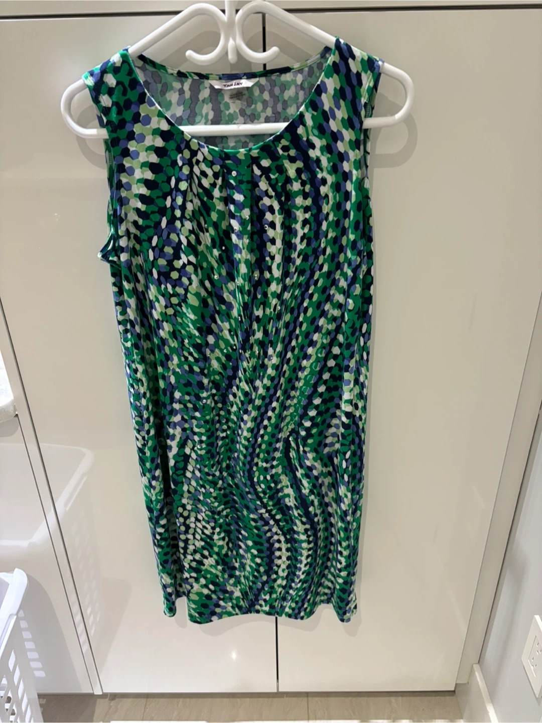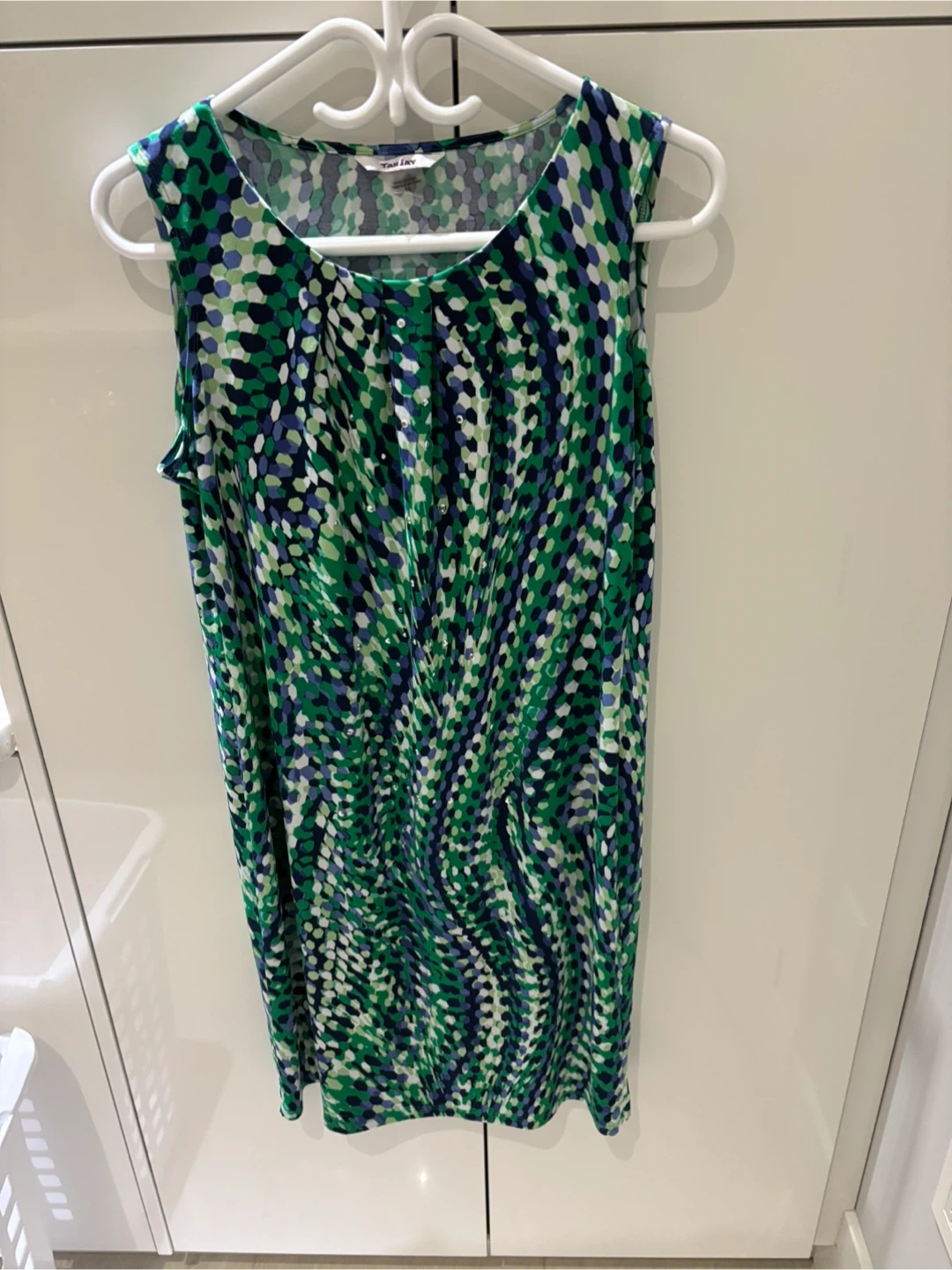 Tanjay dress in size 10. It features a unique pattern with shades of green and blue and some embellishments around the neckline.