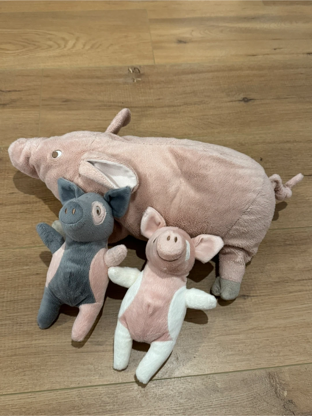 Selling a set of 3 adorable pig stuffed animals from Ikea! There's one large pink pig and two smaller ones in pink, white, and gray. They're in great condition and ready for a new home!