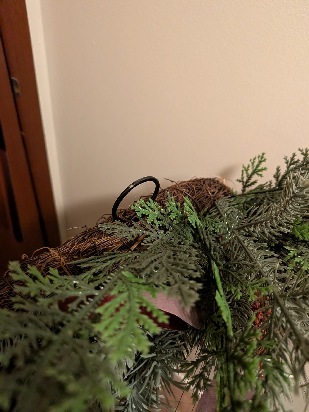 Selling a lovely Christmas wreath! It features a mix of evergreen branches, burgundy leaves, and berry accents. It's perfect for adding a festive touch to your door or living space this holiday season.