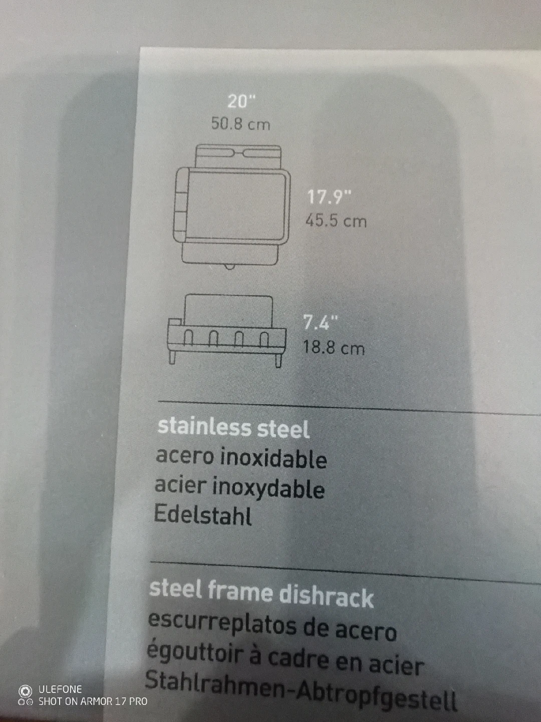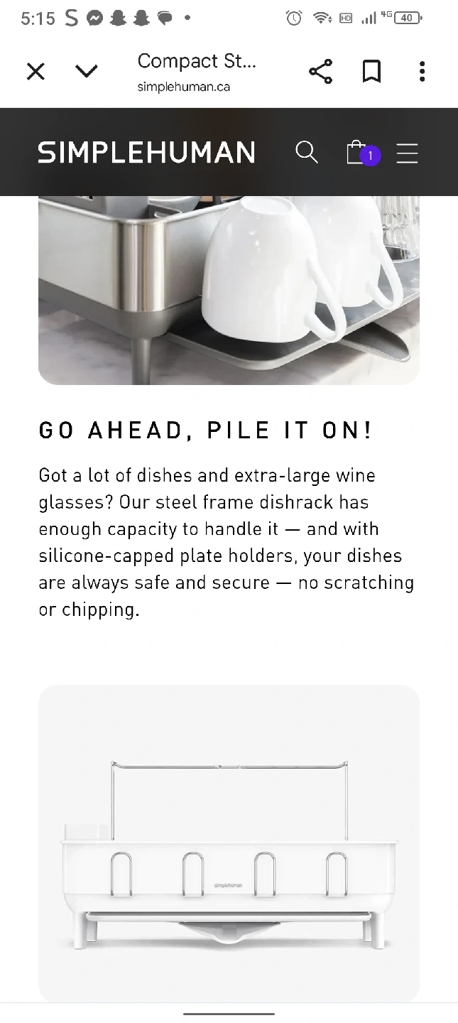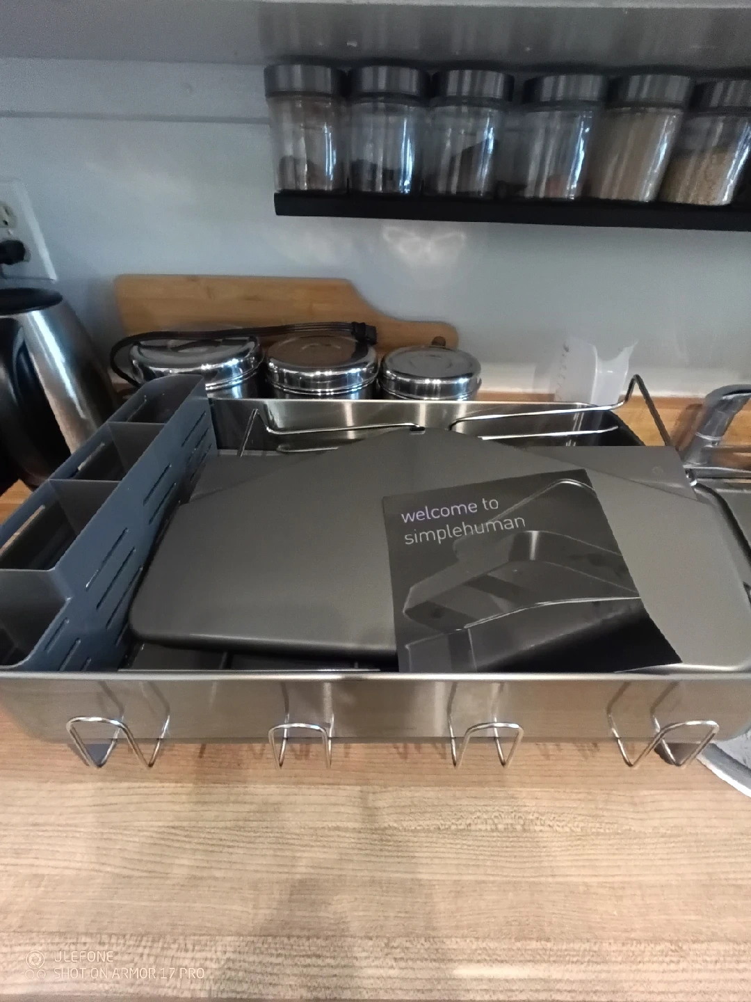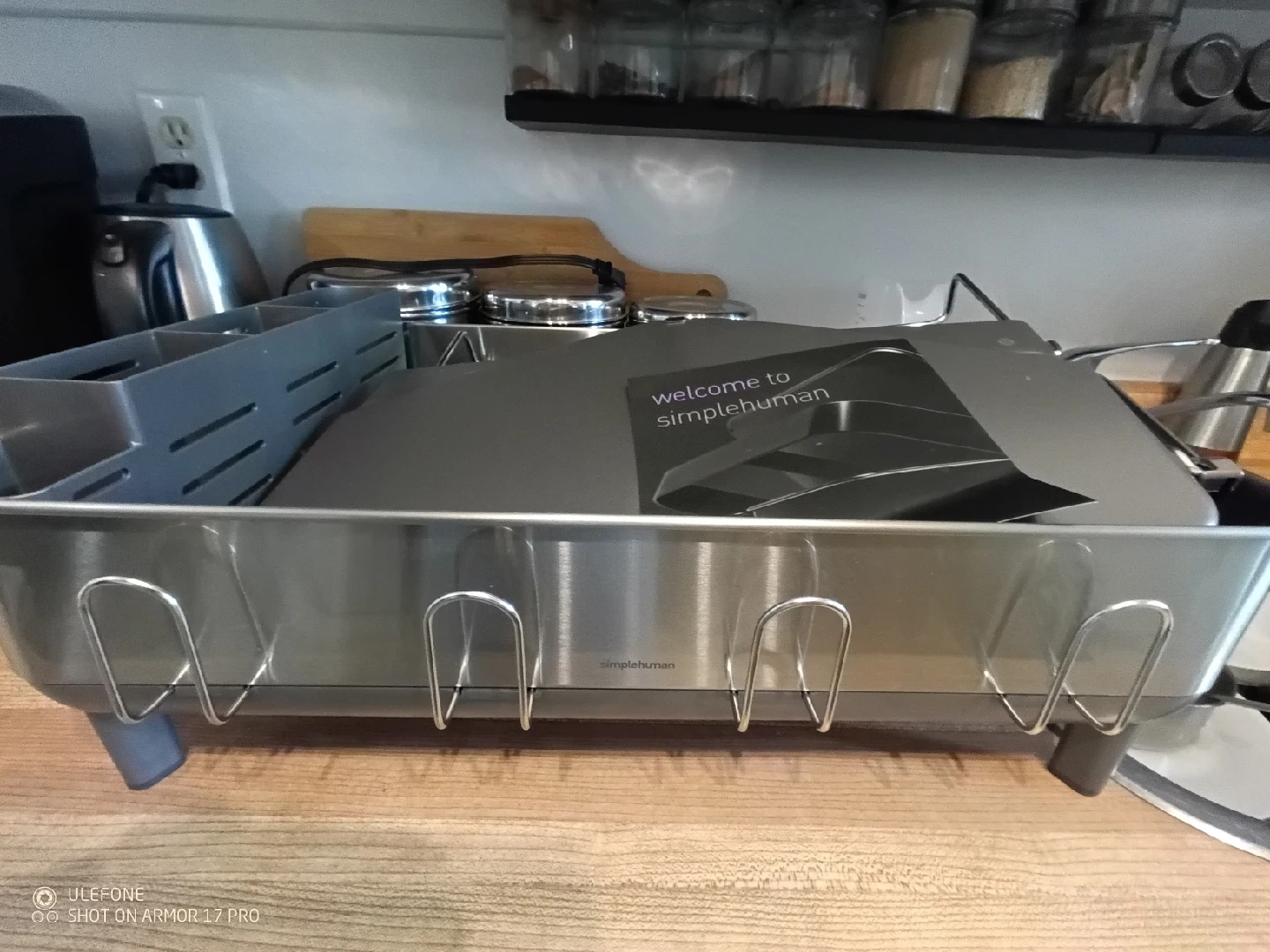 I'm selling a Simplehuman Standard dish rack! It has a large capacity and includes a wine glass holder. New in box.