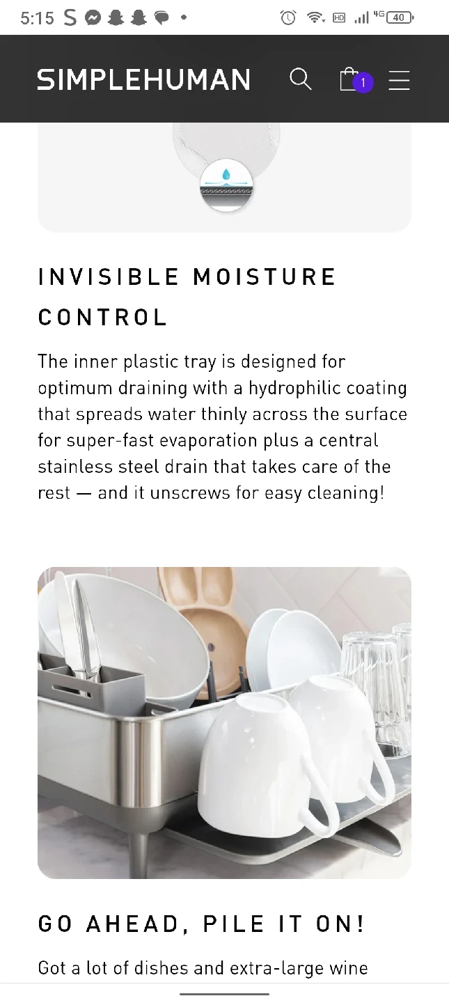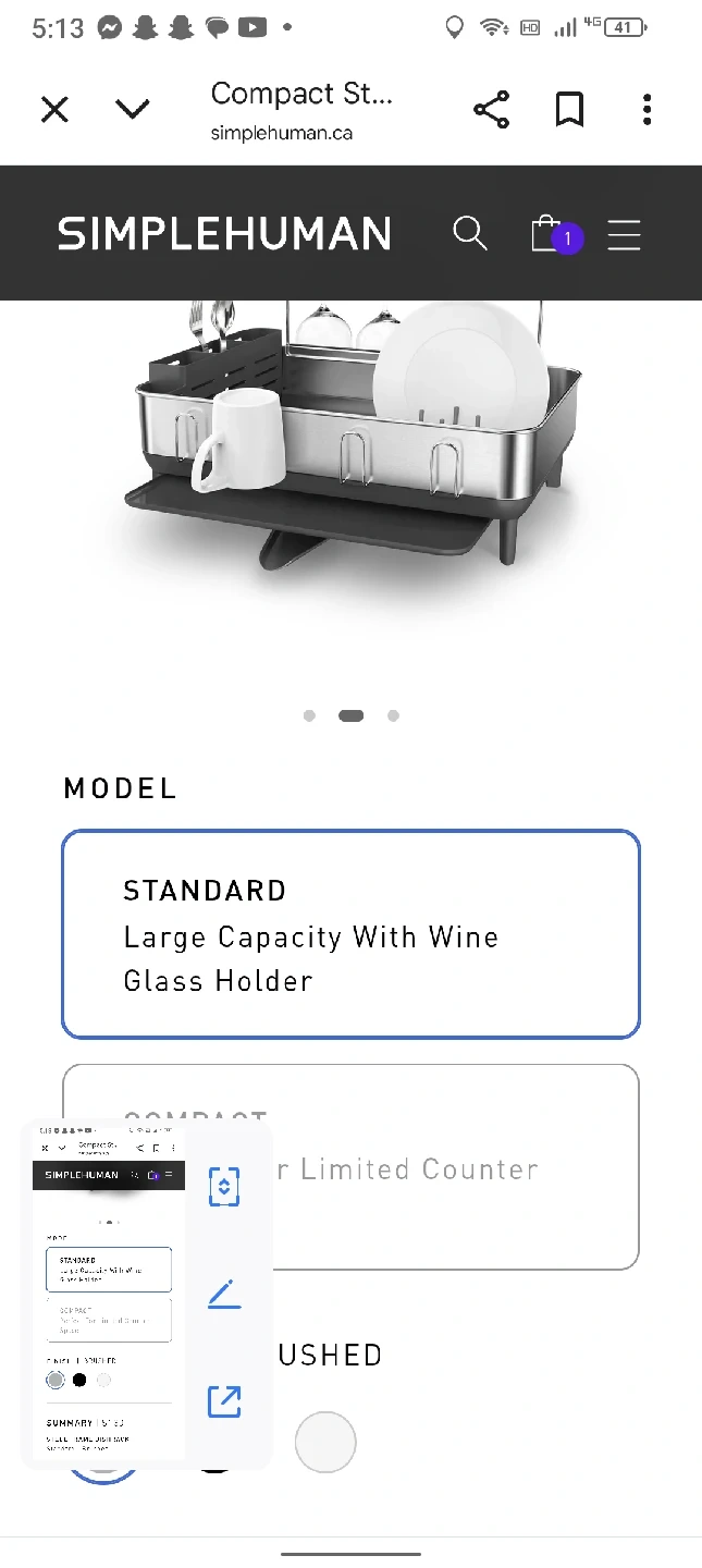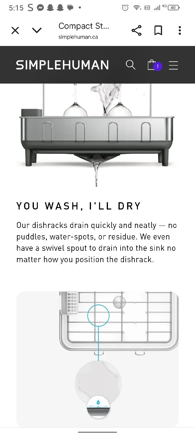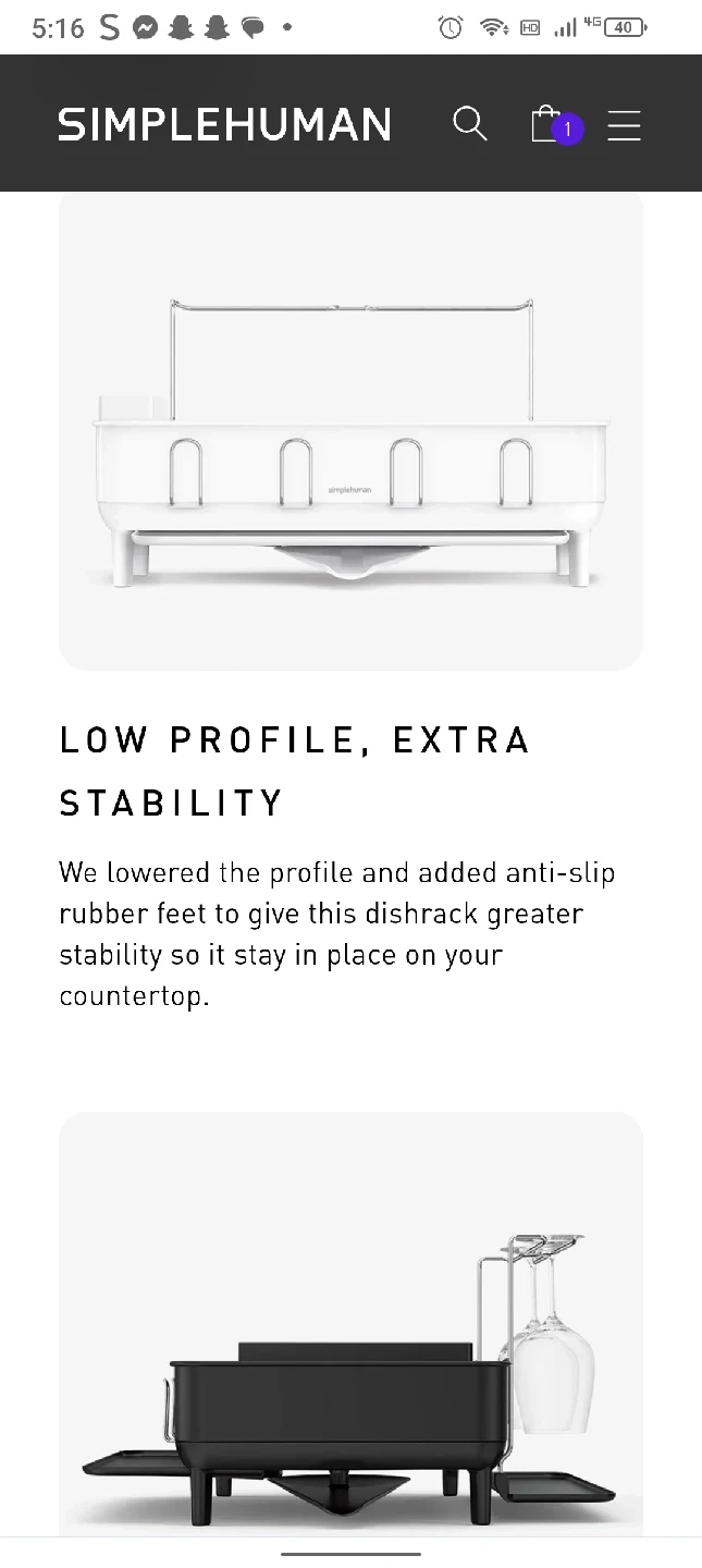 I'm selling a Simplehuman Standard dish rack! It has a large capacity and includes a wine glass holder. New in box.