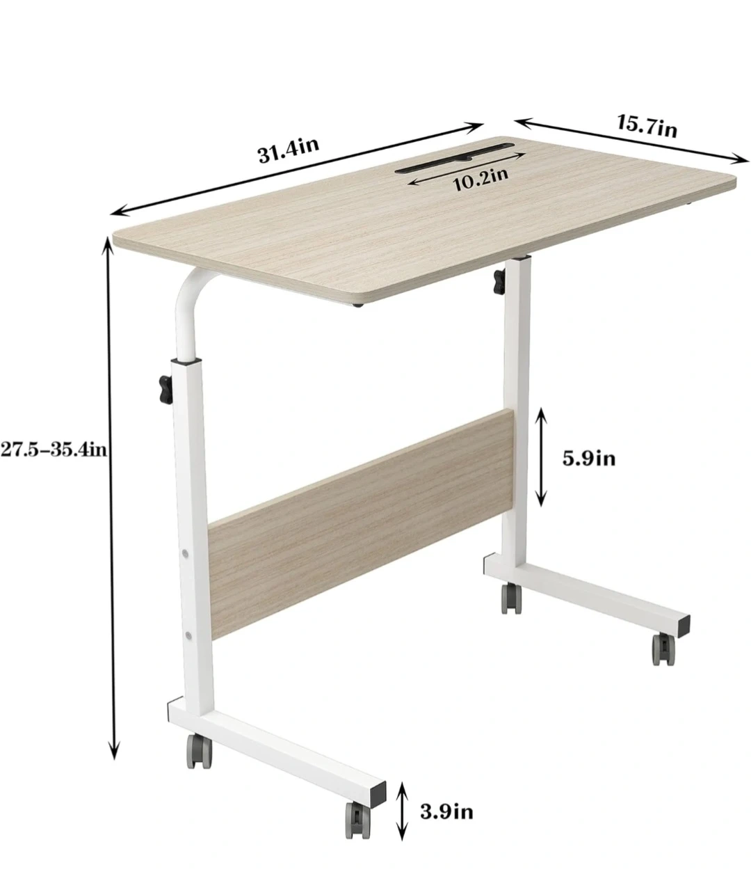 Looking to sell this handy adjustable overbed laptop table! It's perfect for working or relaxing in bed or on the couch. The table has wheels, making it easy to move around. The dimensions are approximately 31.4 inches by 15.7 inches, and the height is adjustable from 27.5 to 35.4 inches