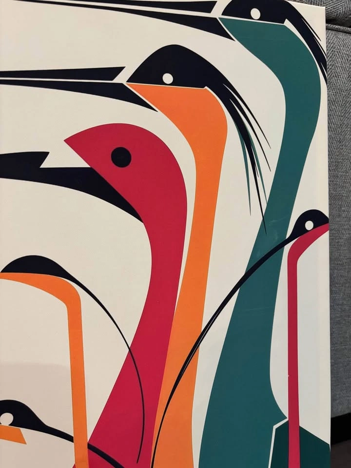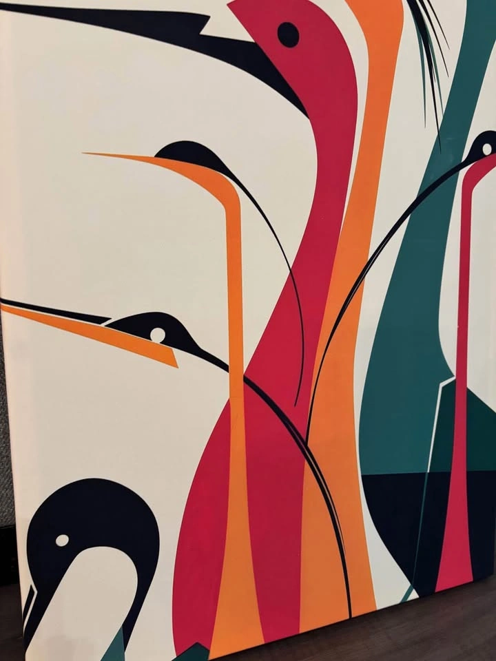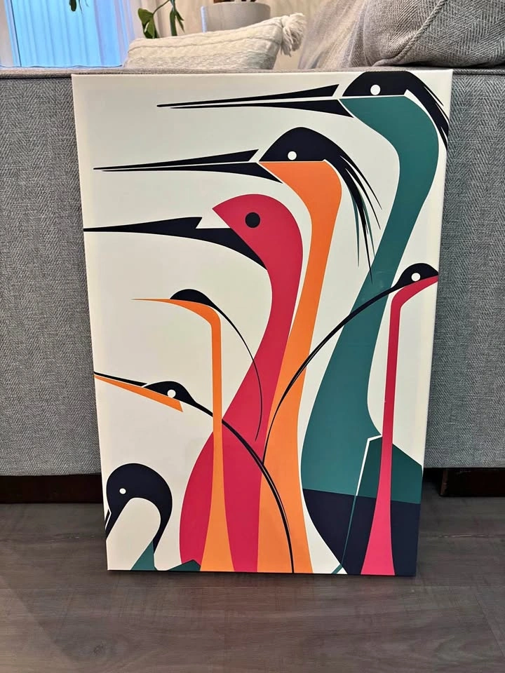 Brand new Mid Century Modern style vibrant bird print on canvas. Framed onto 23.6X15.7”X1.5” gallery frame. Light weight and ready to hang. Pick up North Bowmanville. Check out my other listings for more canvases.