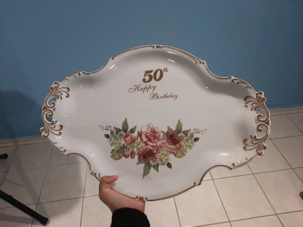 Selling a decorative plate that says "50th Happy Birthday" with a floral design. It's in great condition and perfect for display or as a unique gift