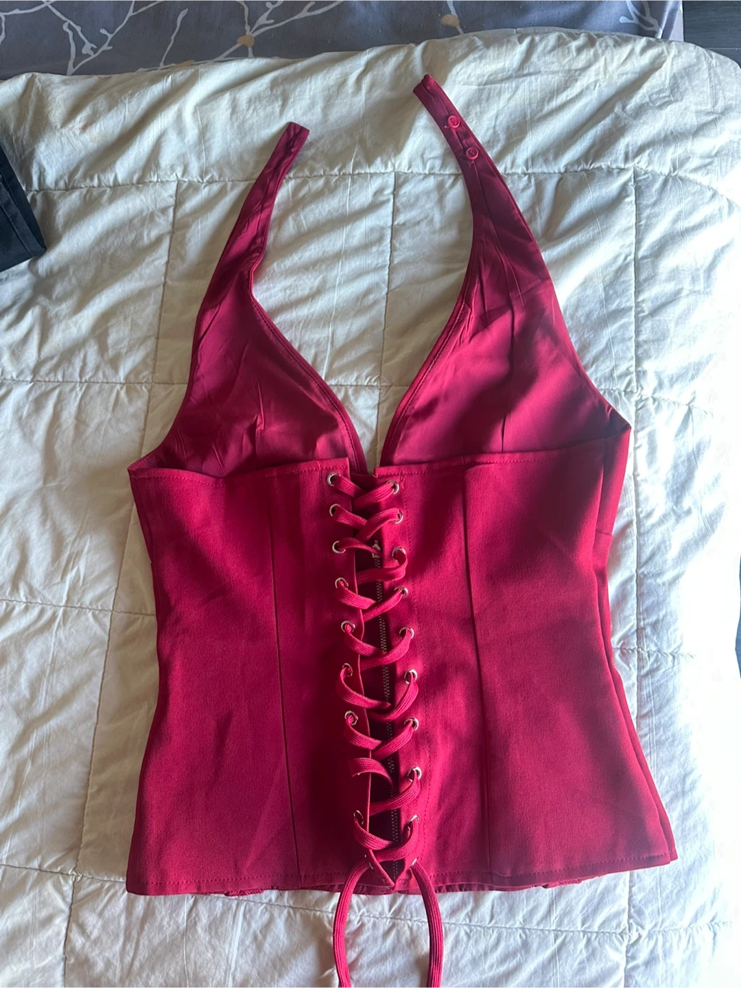 A cute red halter top with corset detailing! It has a zipper closure in the front and lace-up detailing on the sides. Perfect for a night out or a fun summer day