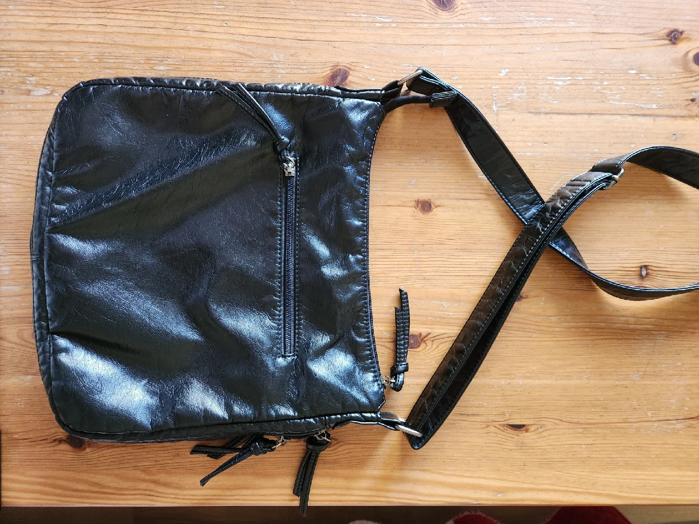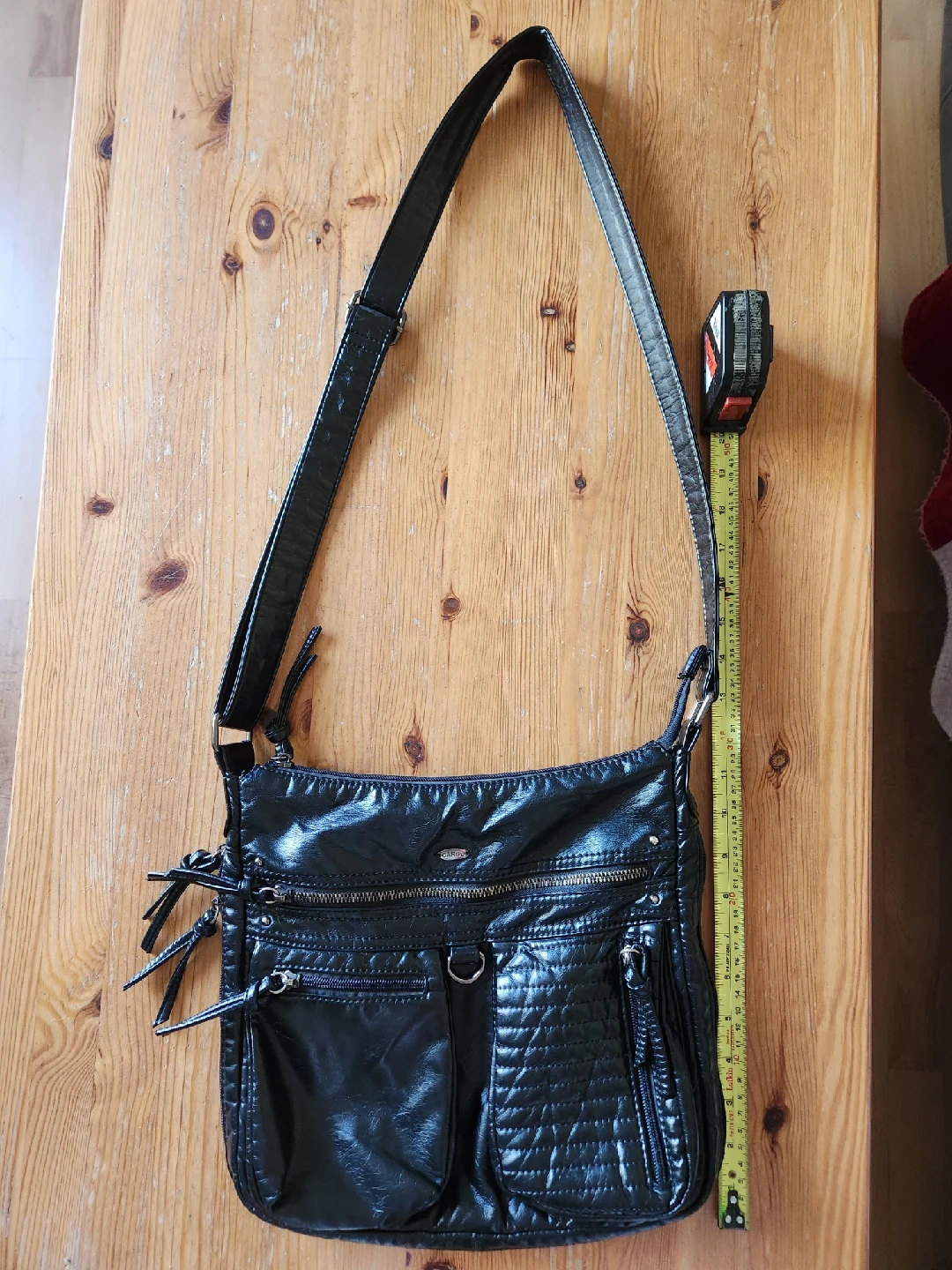 Selling a Cargo black crossbody bag. It's made of faux leather and has lots of pockets. The bag is in good condition and measures about 12 inches across. purchased from Bentley for $60, can view on their website.