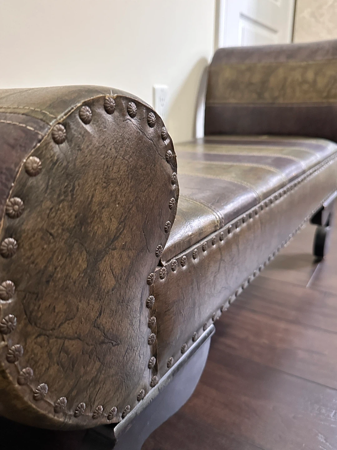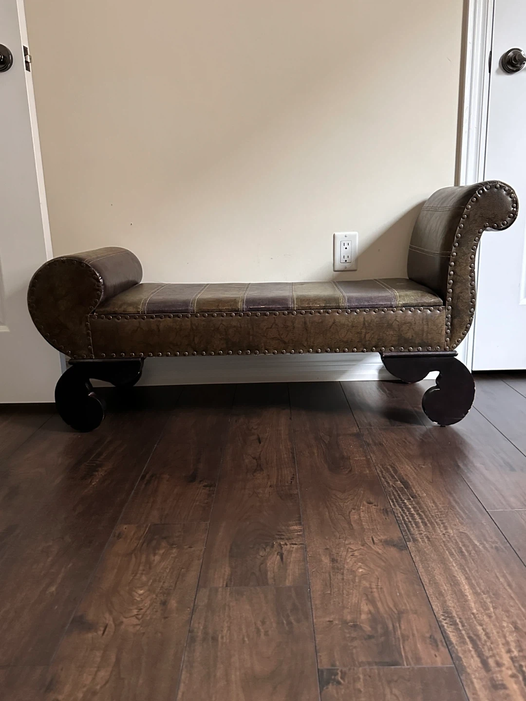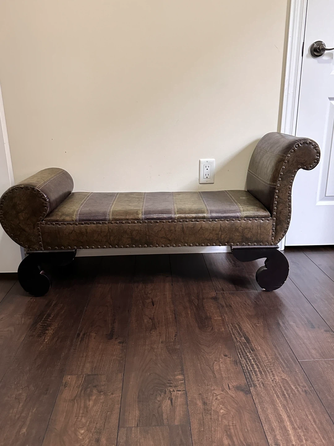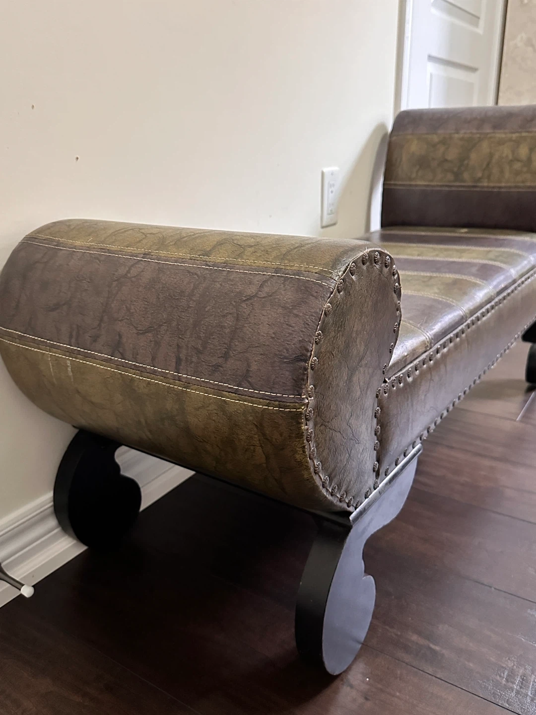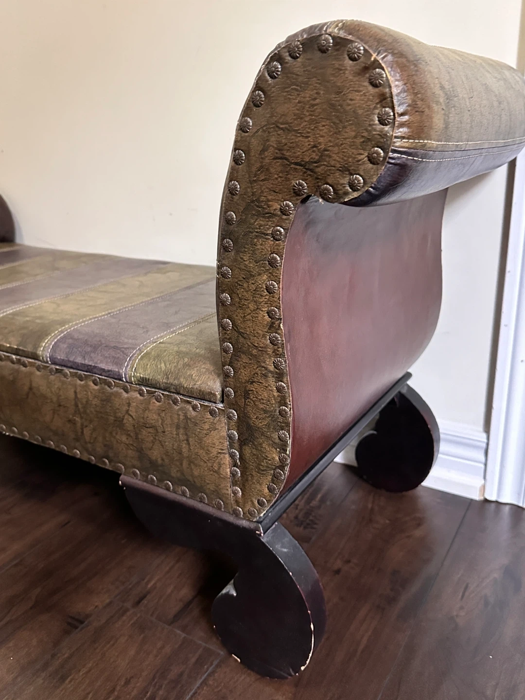 18Carmel padded faux-leather vanity stool. Upholstered arms and seating for comfort and style • Curved wooden legs for a classic, elegant look • Finish: Antique wood Legs • Upholstery color: Mix Design, Leather brown, Tiger pattern • Sits 2 person comfortably • Upholstery fill: Medium-Firm support foam insert • Upholstery materials: Hand-stitched faux leather finish • Seat dimensions: 33 inches long x 16 inches deep