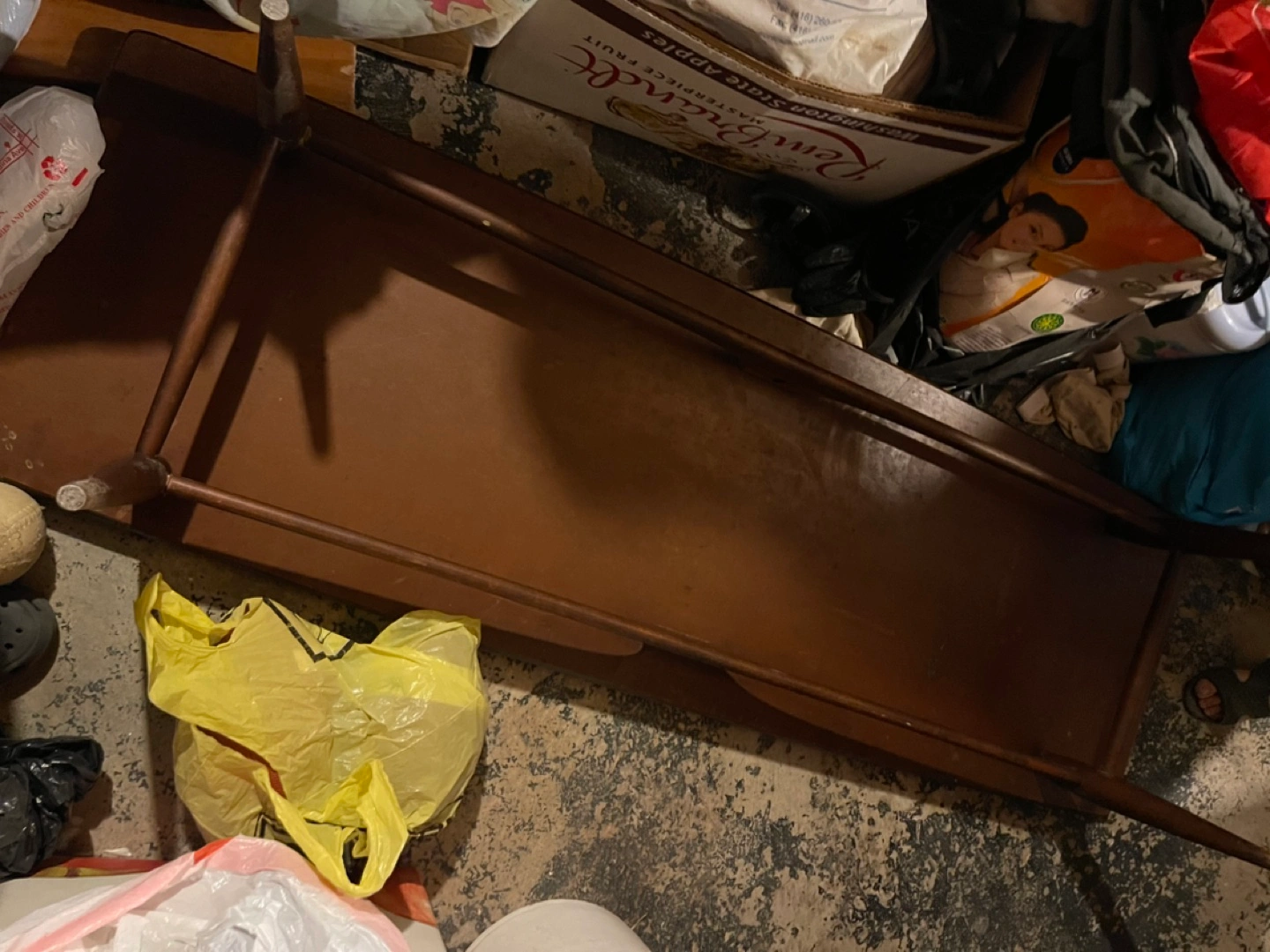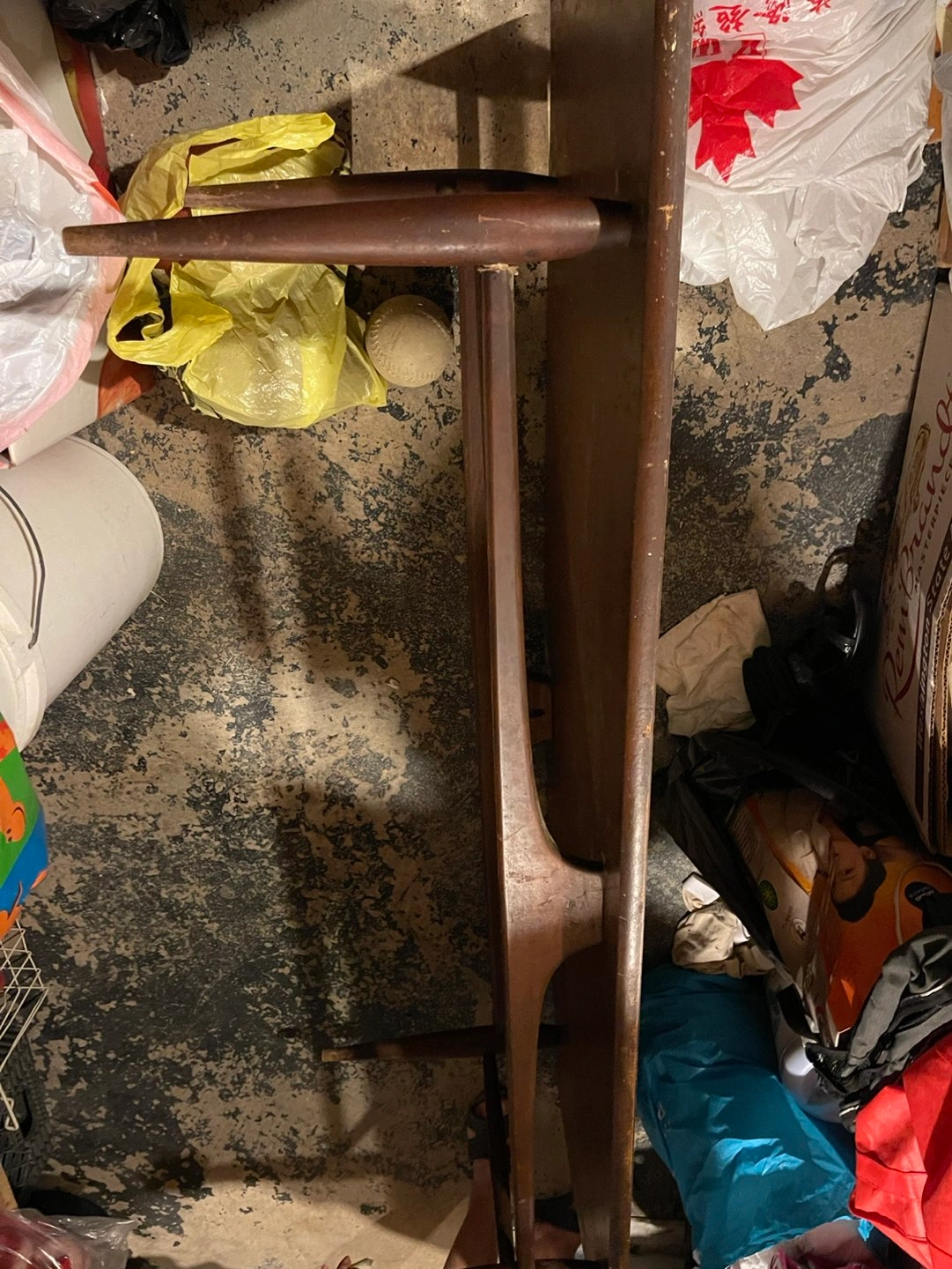 Old, scratches, scrapes, wood loose but with some glue, screw tightened and a fresh paint will do the job.
