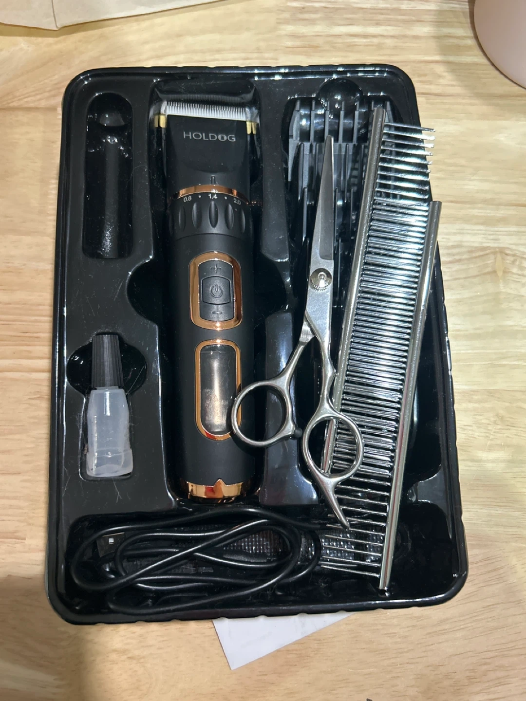 I have a like new set of HOLDOG pet grooming clippers still in the box! This set includes the clippers, scissors, comb, and other accessories to keep your furry friend looking their best. Everything is in perfect condition and ready for a new home. Only use two or three times