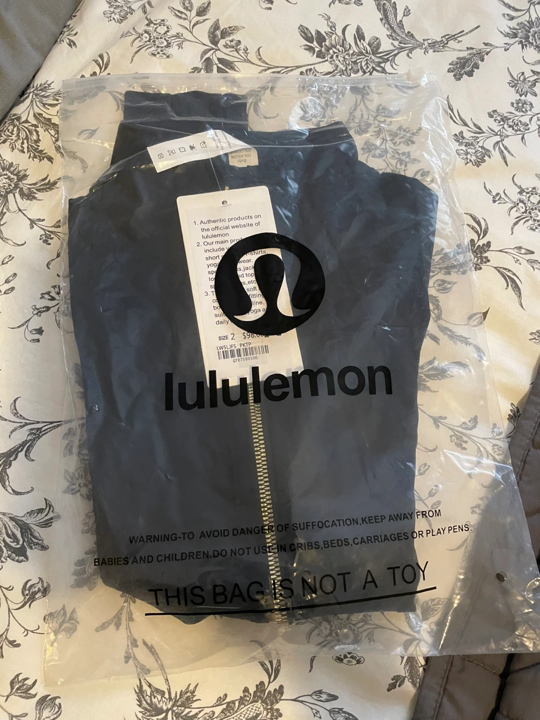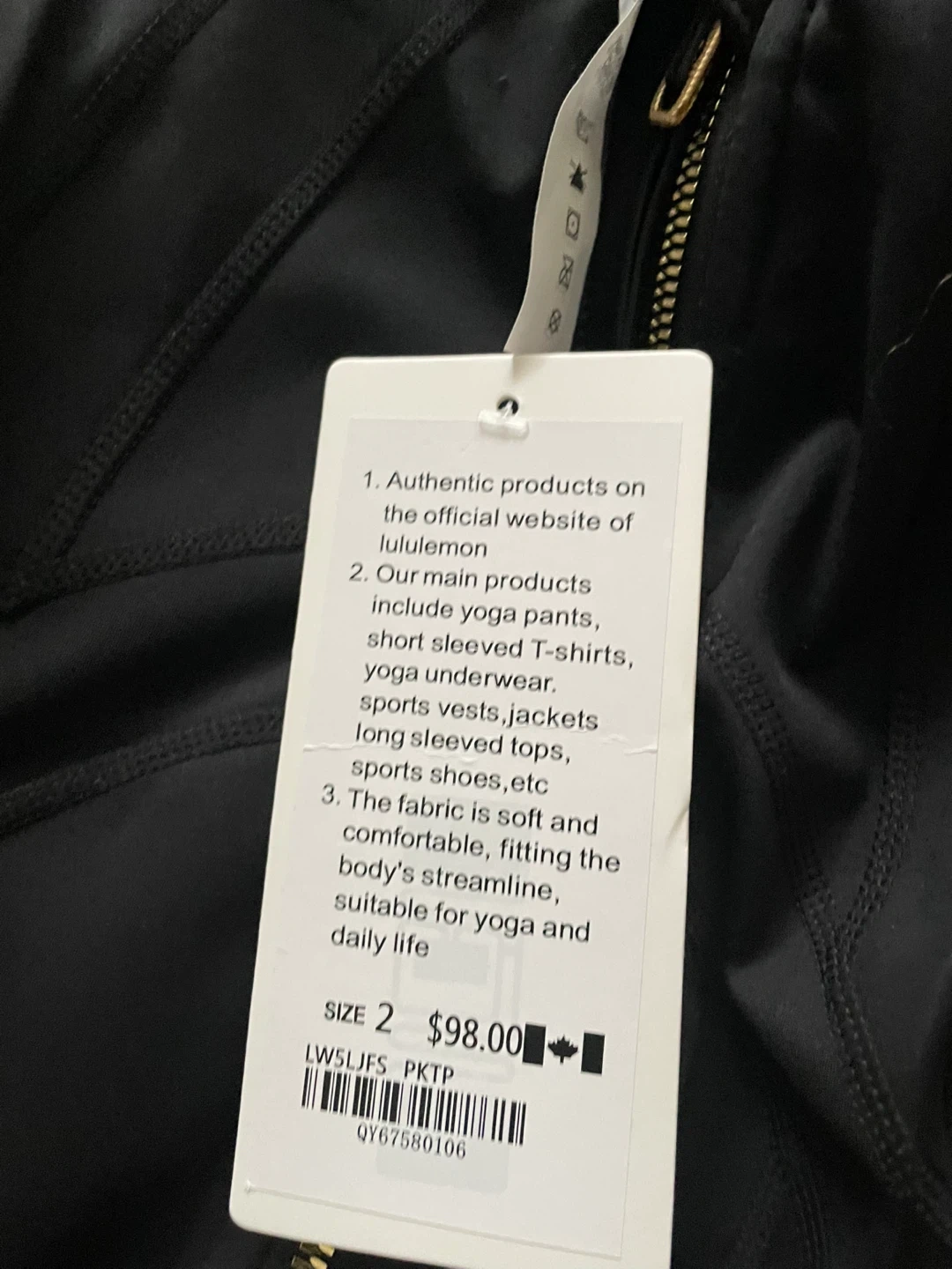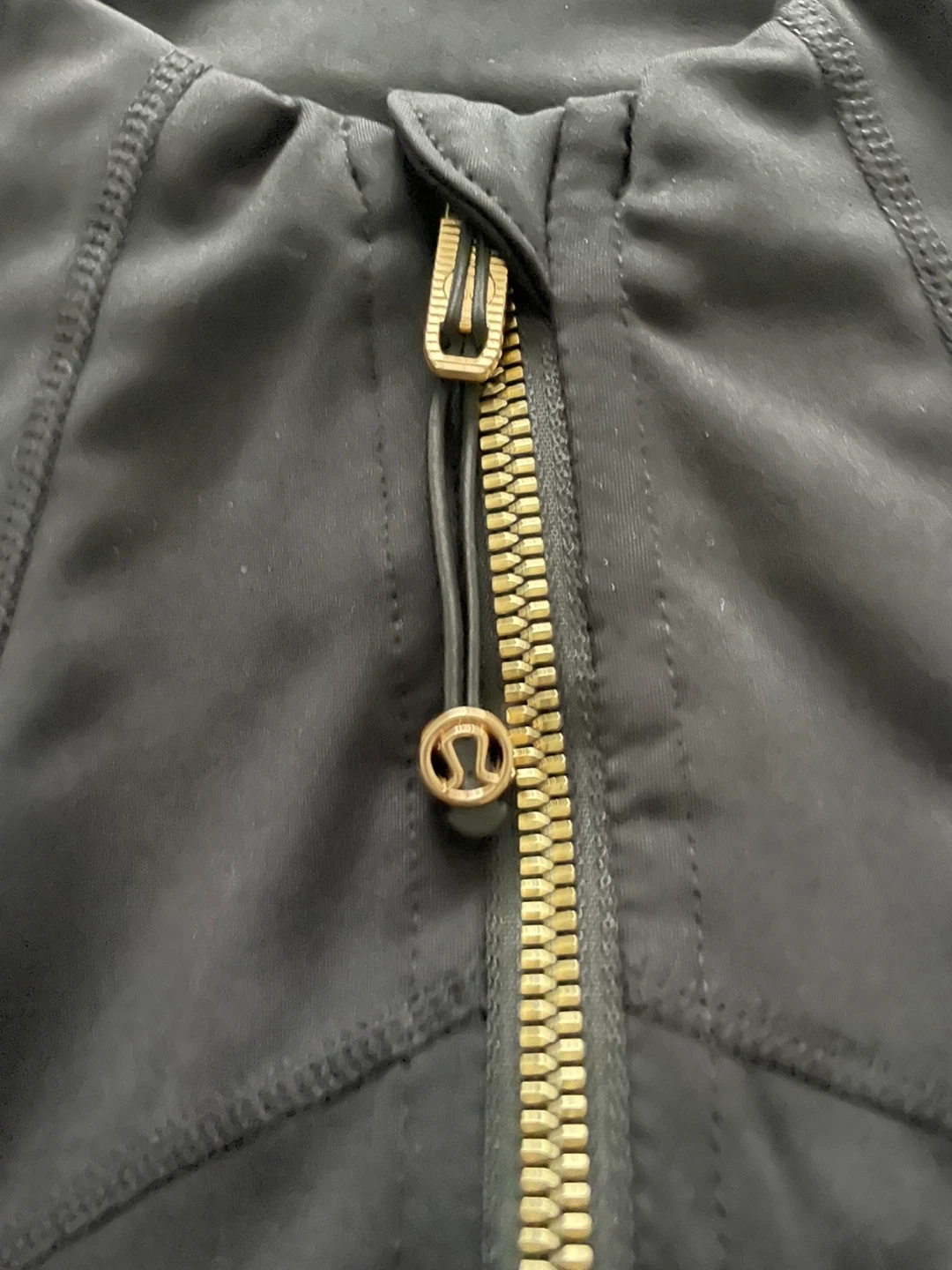 Selling a Lululemon Define Jacket in black, size 2. The tag mentions that the fabric is soft and comfortable, fitting the body's streamline, suitable for yoga and daily life.