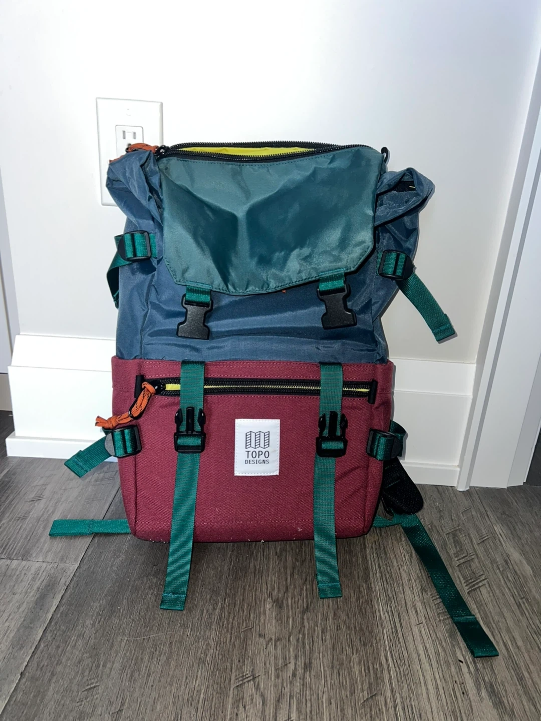 Selling a Topo Designs backpack! It's in great condition and has a cool colour block design with blue, teal, and burgundy. Perfect for school, work, or day trips around town!
