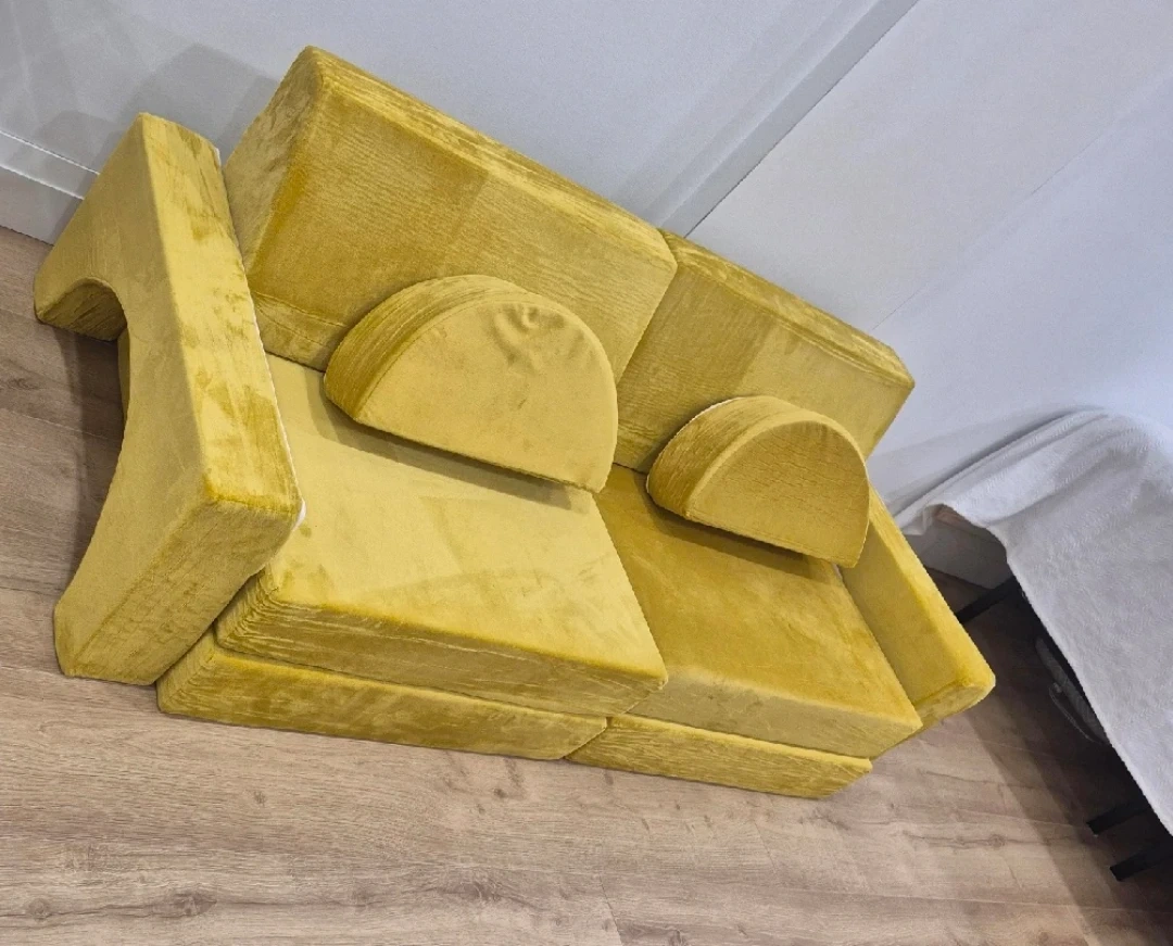 10Selling a kids' yellow foam modulad play couch in excellent condition! It measures 62 inches in length, 21 inches in height, and 26 inches in depth. Perfect for playtime and relaxation!