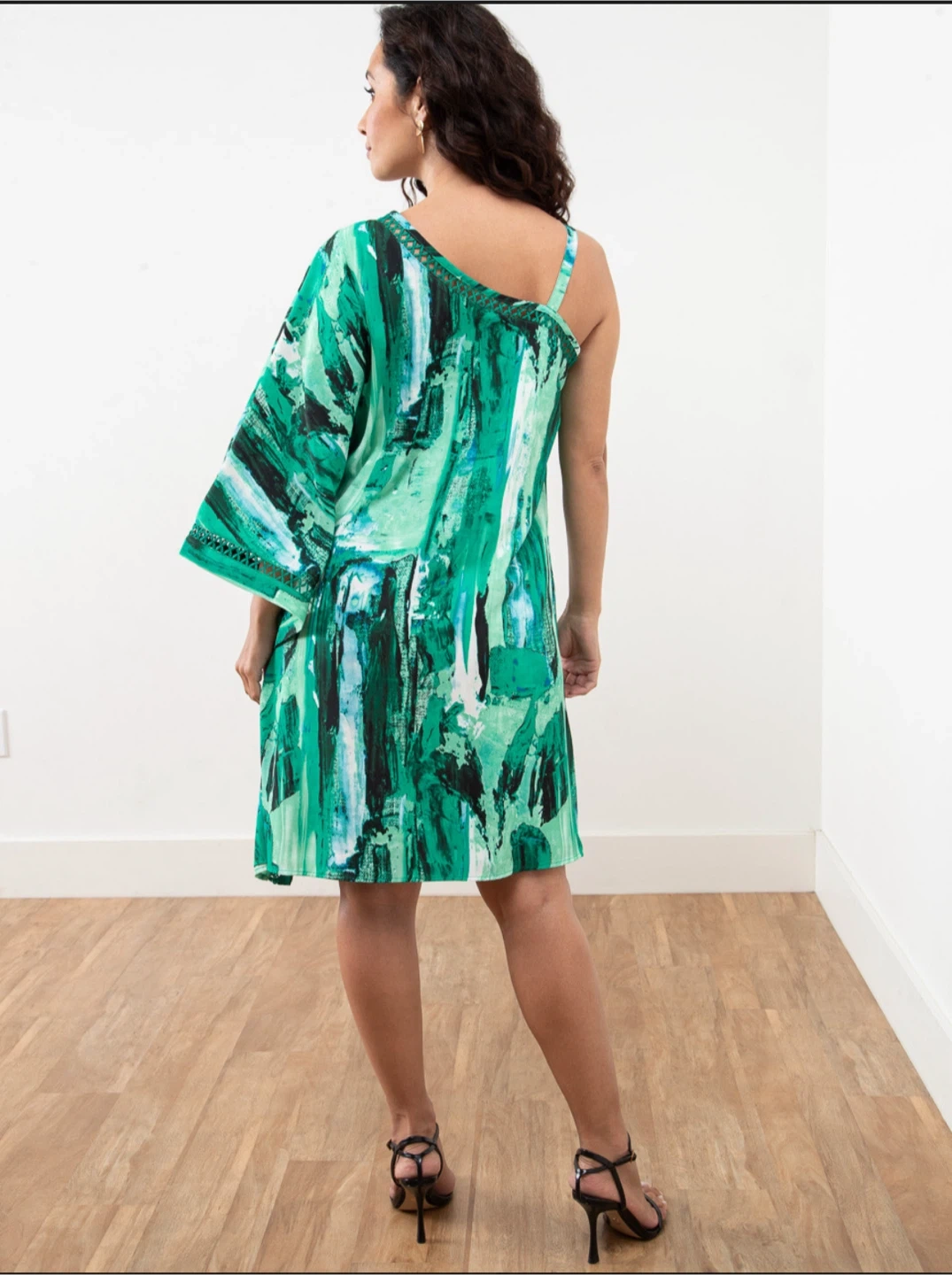 This is a stylish one-shoulder dress featuring a vibrant green abstract print. It would be a great addition to your wardrobe for any occasion! New with tags. Pet free smoke free home.