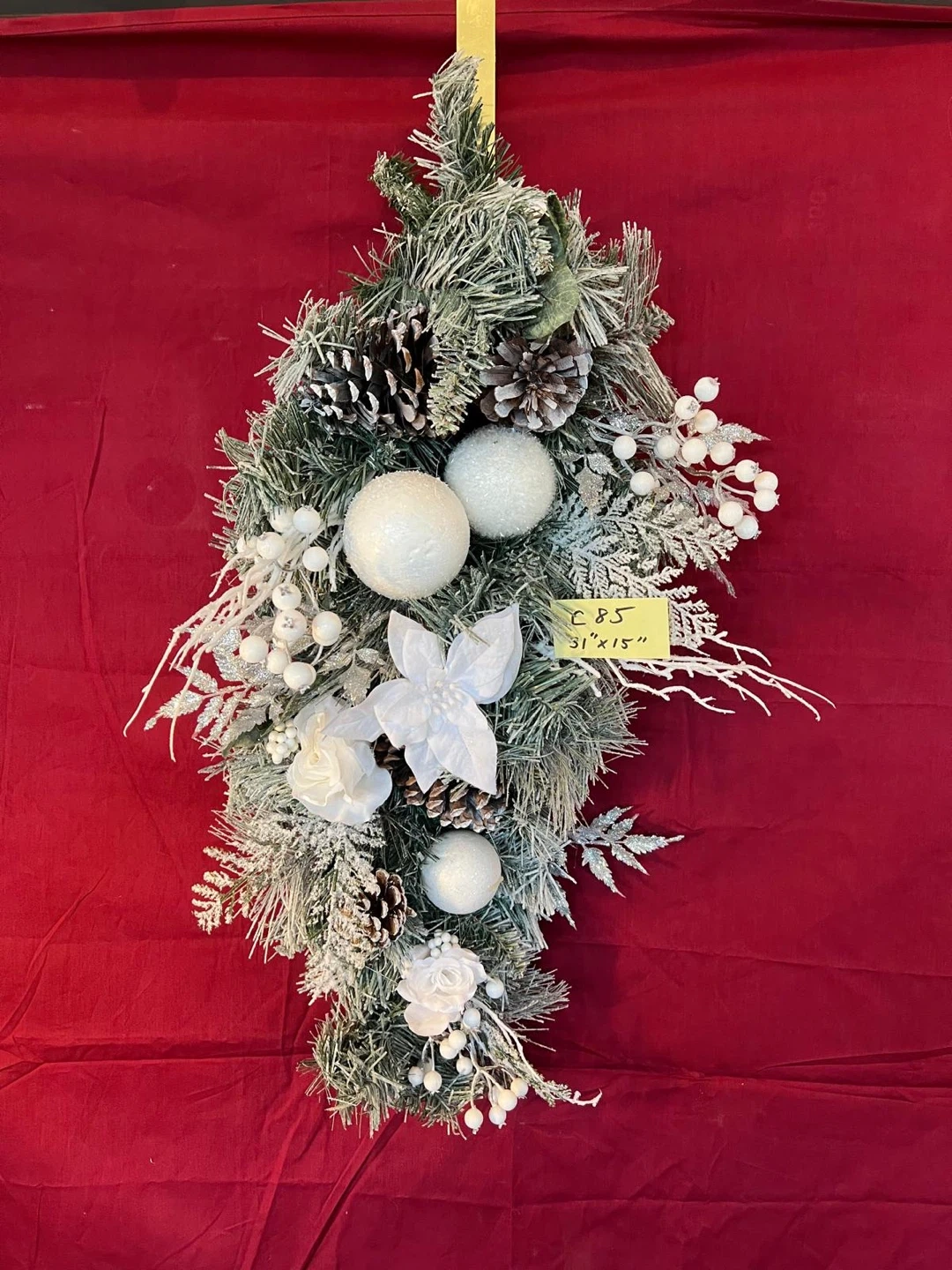 Beautiful Christmas swag for your door or wall! It measures 31 inches by 15 inches and features frosted greenery, pinecones, white ornaments, and white flowers.