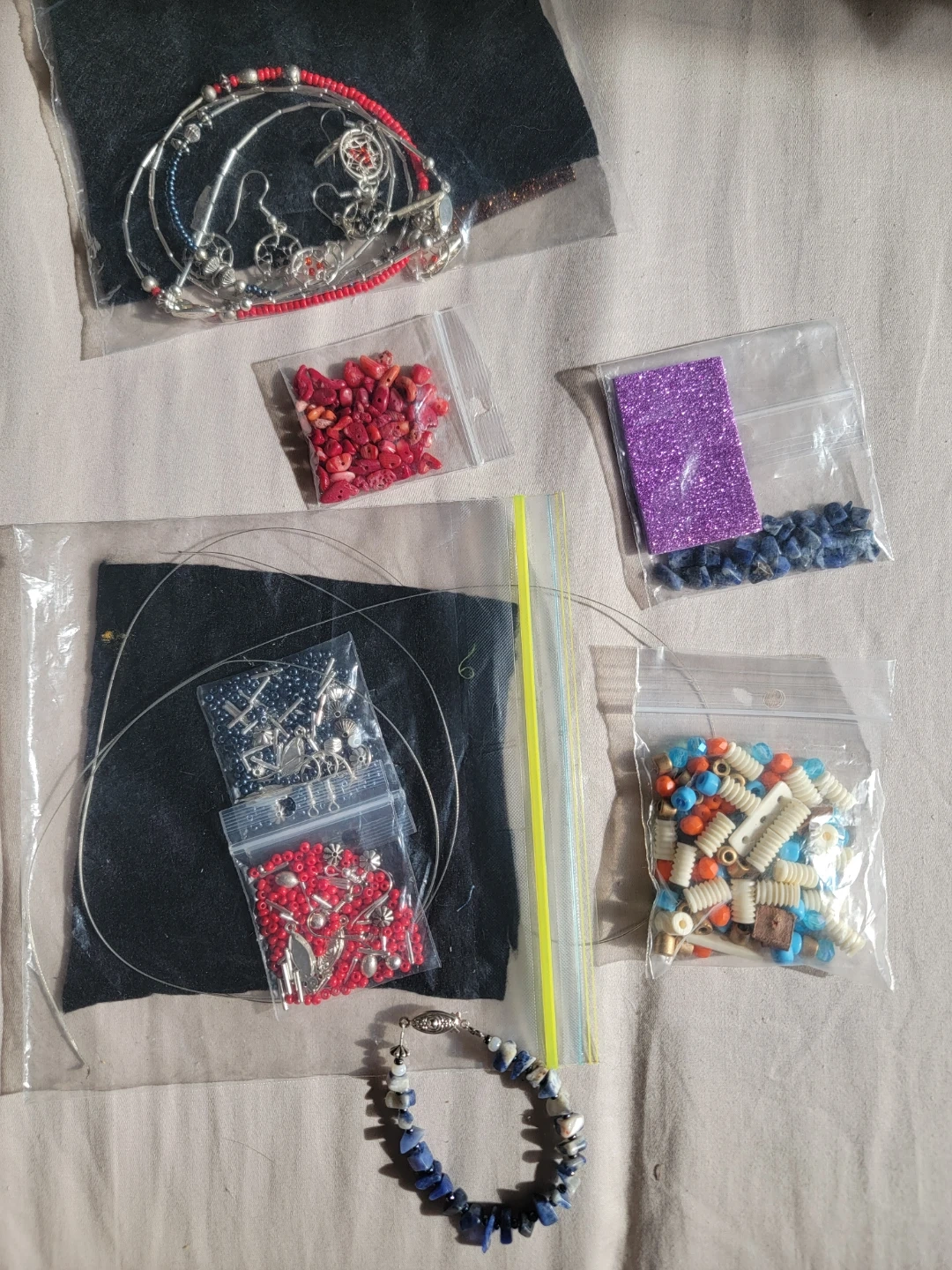 I'm selling a collection of beading supplies! Includes various beads, wire, and a piece of black felt. Great for starting a new hobby or adding to your existing collection
