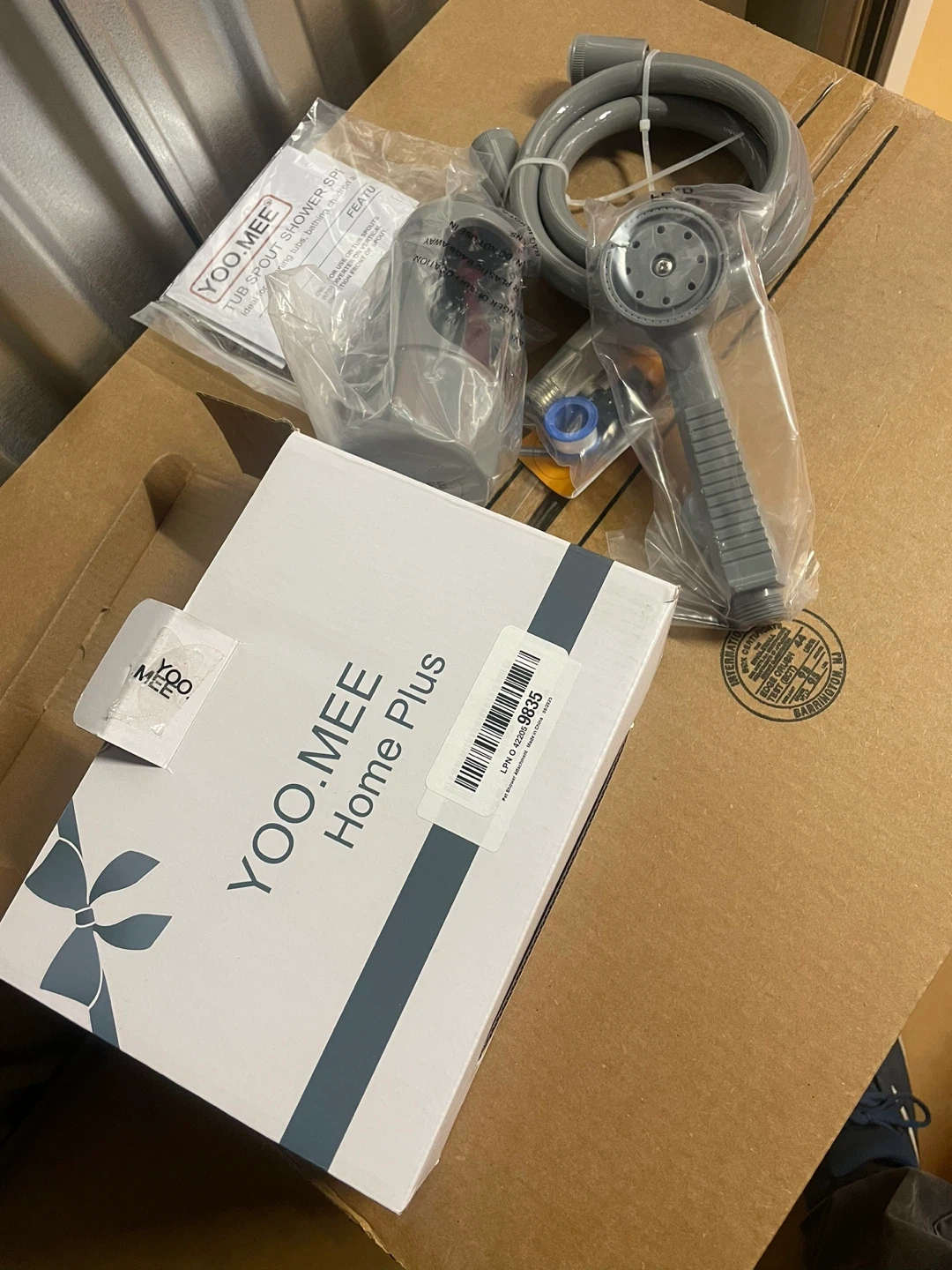 Selling a YOO.MEE Home Plus tub spout shower set! It's ideal for cleaning tubs and bathing children. It can be used on vertical or diverter tub spouts. Box is included!