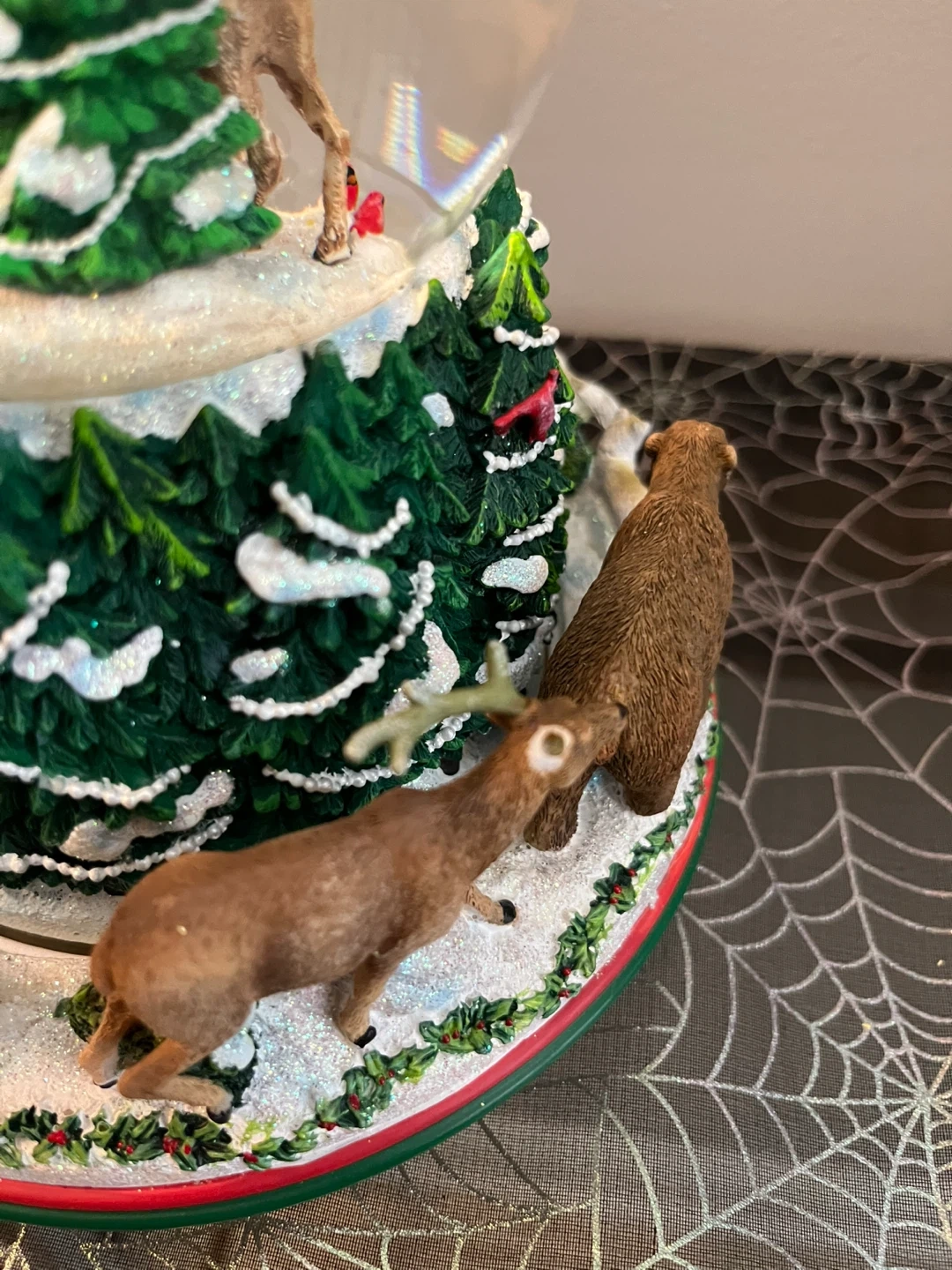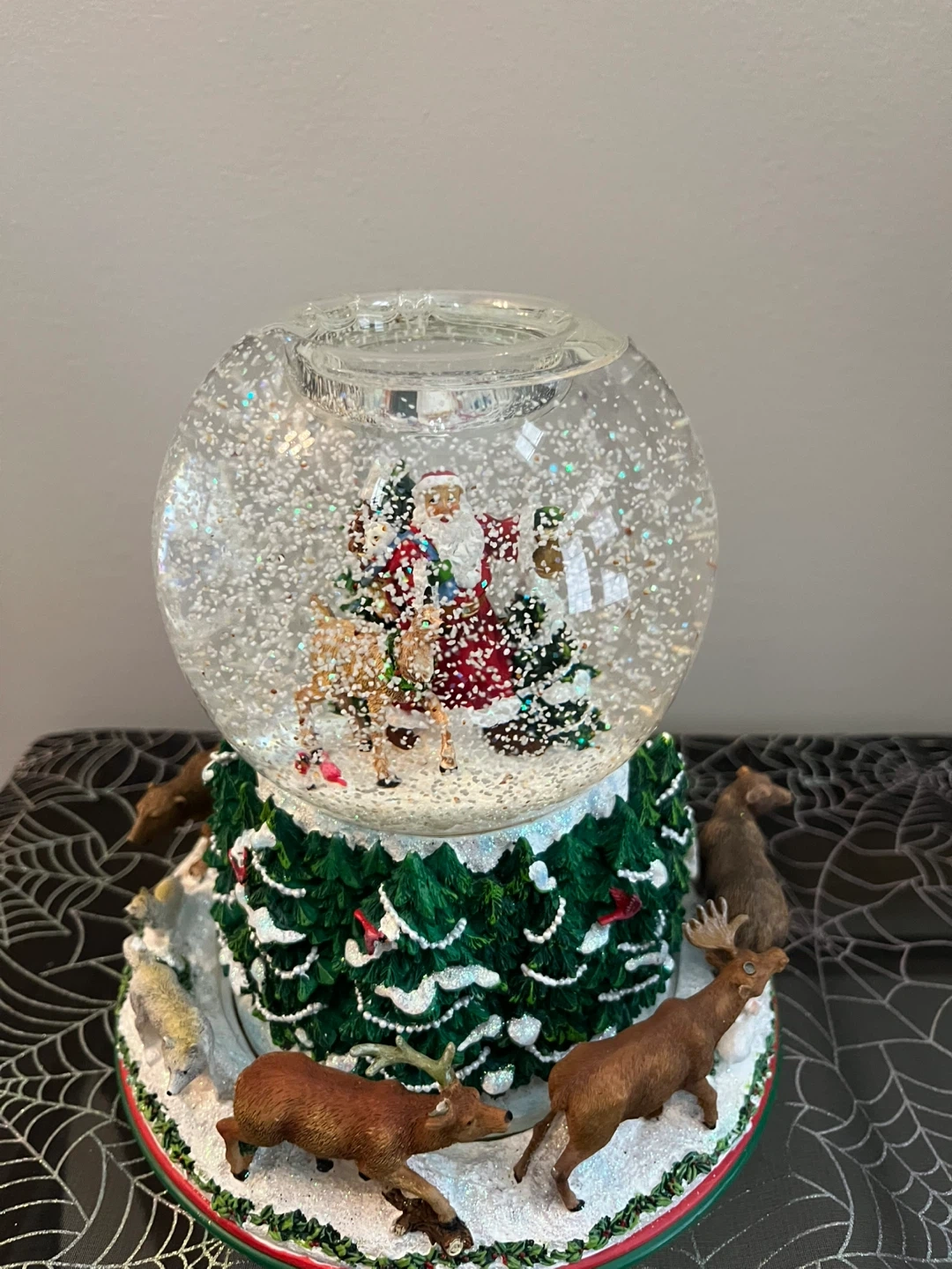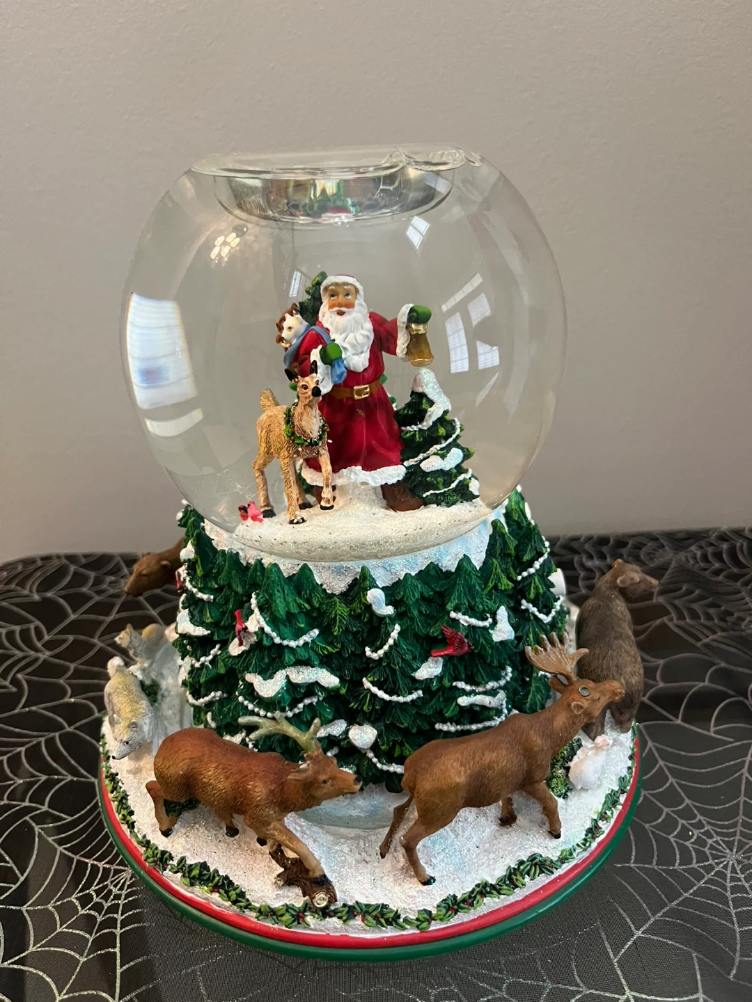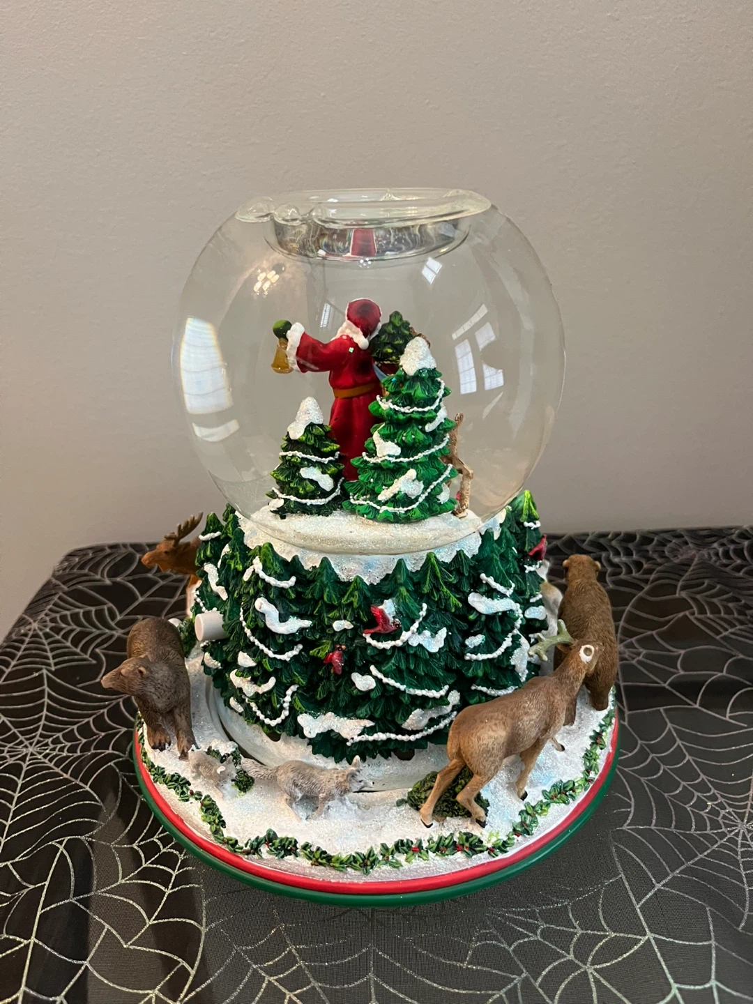 Selling a charming Partylite snow globe featuring Santa and woodland creatures! It also doubles as a candle holder! It's in great condition and ready to add some holiday cheer to your home/ moving sale/smoke free home- one reindeer at the back is missing one antler