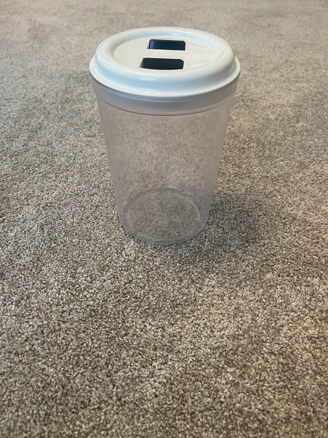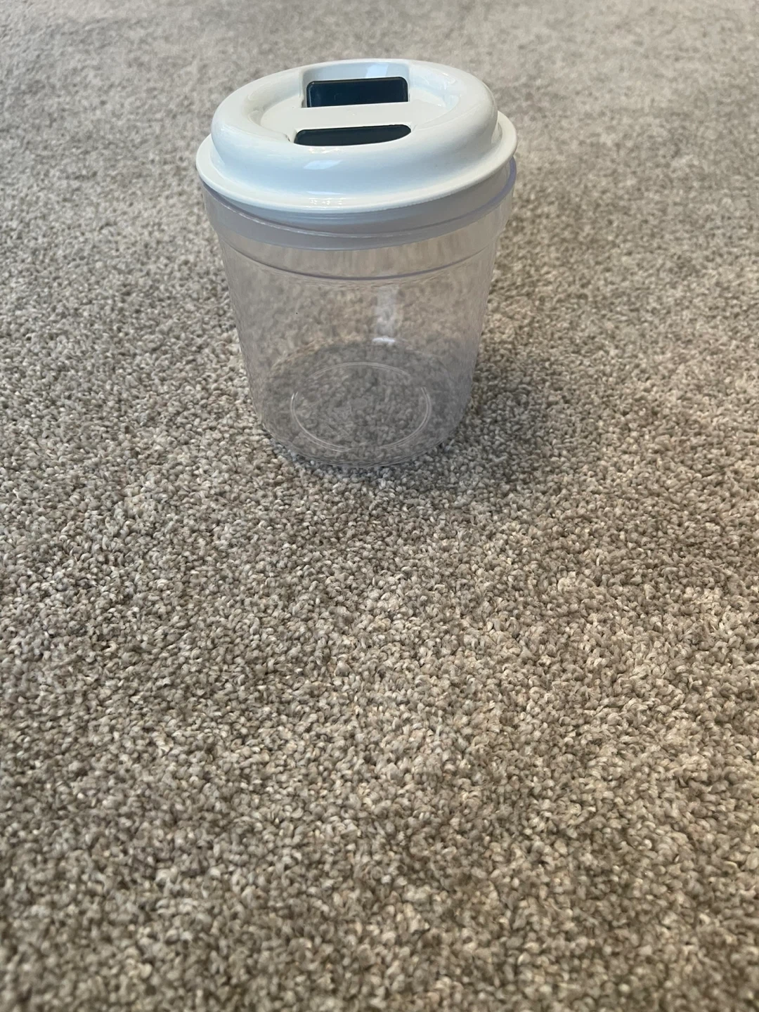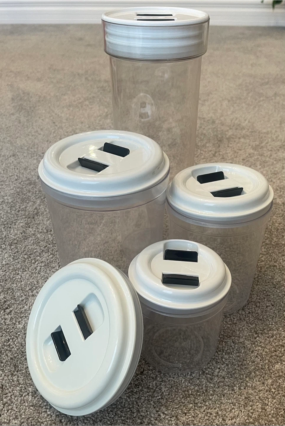 I have some clear plastic food storage containers for sale. They have white lids with a unique sliding closure. Great for pantry organization! 6 dollars each and 18 for all three. The tallest container is a free bonus and so is the extra lid!