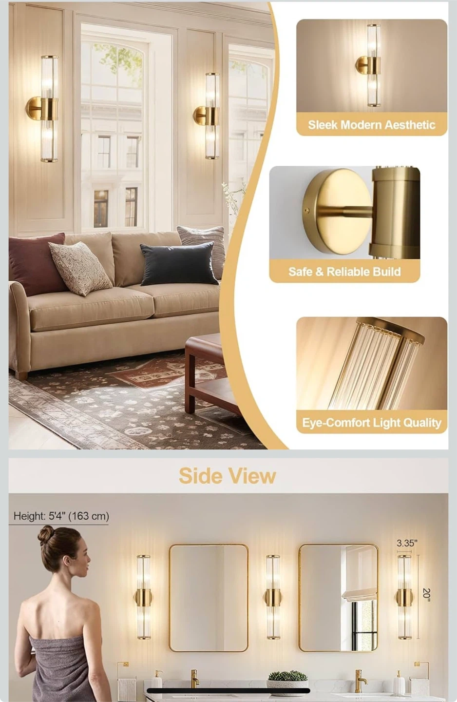 Add a touch of modern elegance to your space with this stunning crystal wall sconce! It features a sleek modern aesthetic and provides eye-comfort light quality. The build is safe and reliable, ensuring long-lasting use. Perfect for the study room, bedroom, hallway, or bathroom vanity/mirror. Height is 20 inches and width is 3.35 inches.