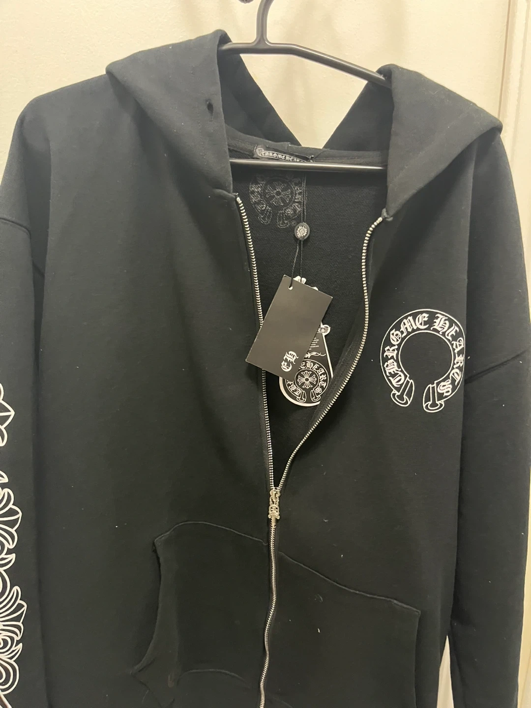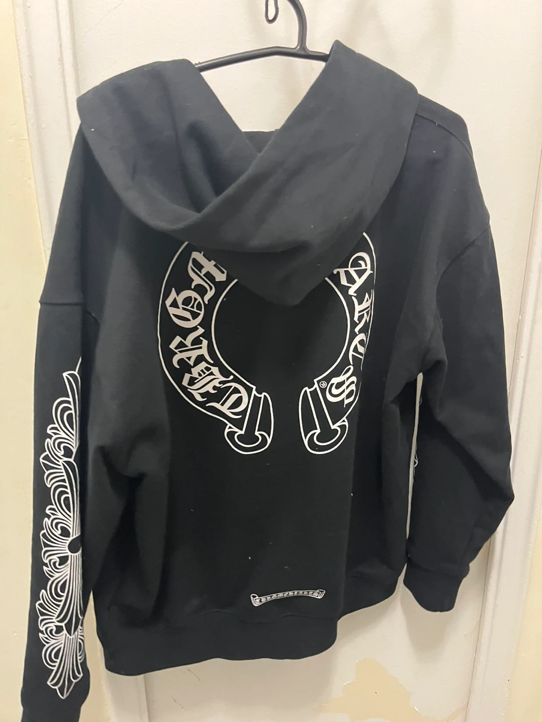 Selling a Chrome Hearts black zip-up hoodie. It features the classic Chrome Hearts logo on the back and sleeves. Great for adding a bit of edge to your everyday look!