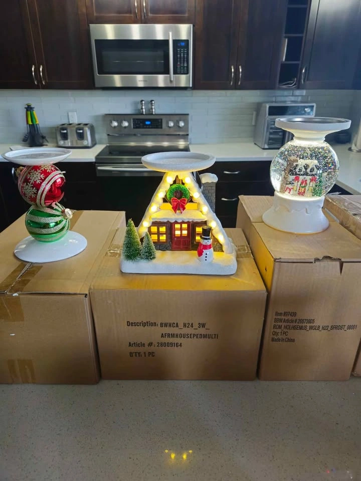 2 × Holiday House Glitter Water Globe 3 Wick Candle Holder( lights up/plays xmas music and takes 3 AA Batteries that are not included) has 2 modes...you can light up only or play music and light up. NEW with original boxes.$45 EACH