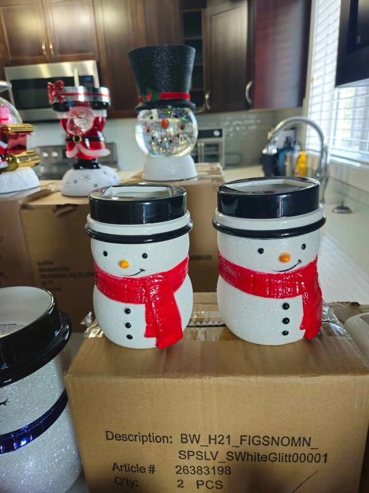 2 x Snowman with black hat glitter 3 Wick Candle Holder Water Globe. NEW and comes with original boxes. $55 each