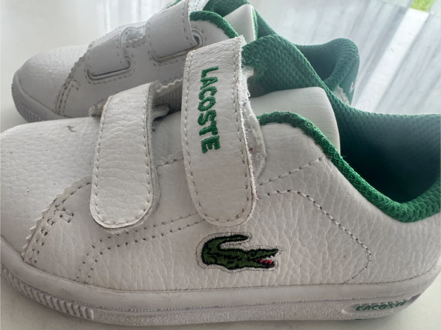 Selling a pair of Lacoste kids' sneakers in white with green accents! They have a classic look with the Lacoste logo and a velcro strap, perfect for easy wear. The size is 6 (US).