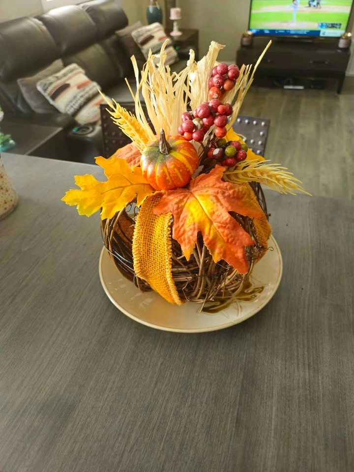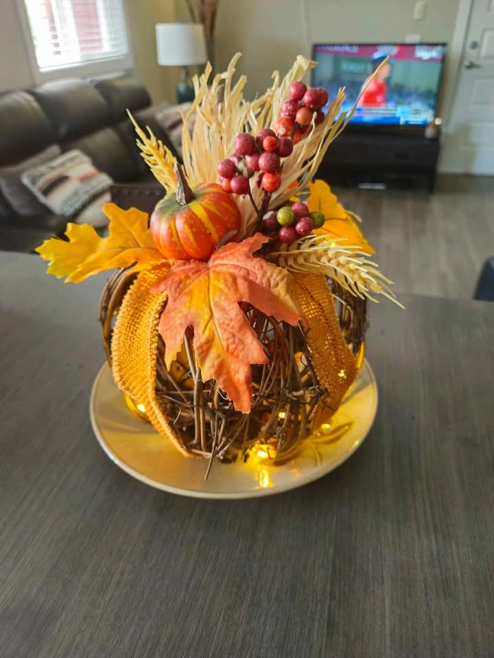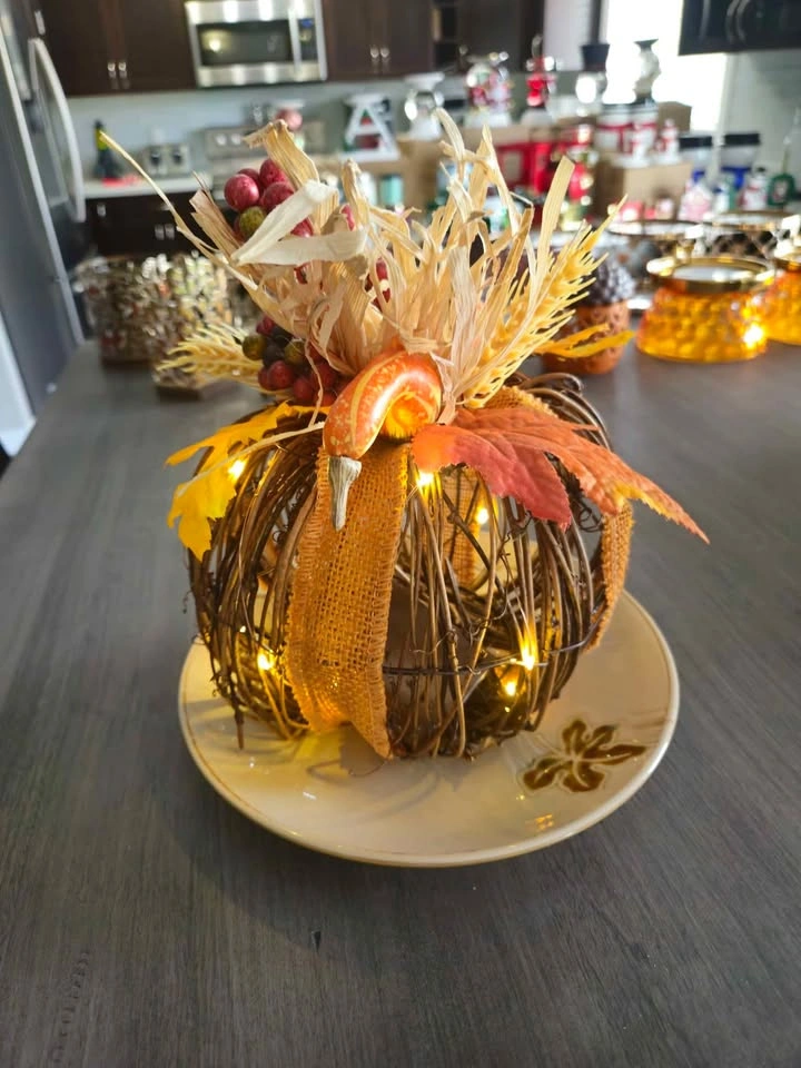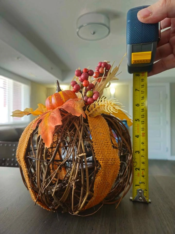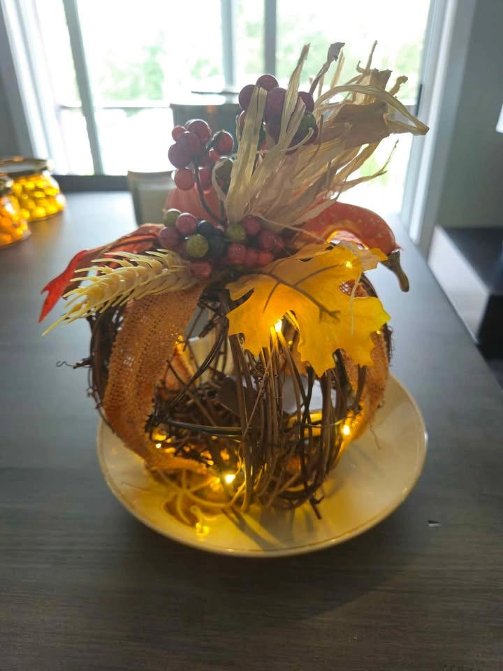 This is a pumpkin shaped styled home decor accent that lights up. Takes 3 AA batteries i believe) not included. Has interior string lights that light up) see the pics). Is about 8 inches tall at its highest( there is a pic with my tape measure beside it). I put it on a small salad plate to show the diamater size for reference. Is beautiful lit up. These pics were taken in the late afternoon in daylight. Is like new and $25