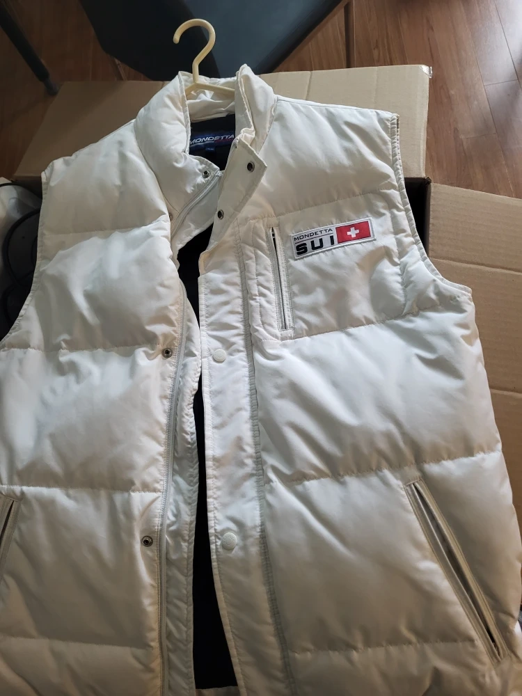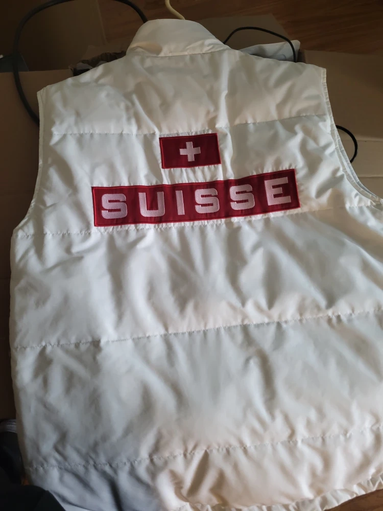 Selling a Mondetta Sport white puffer vest. It has a Swiss flag patch with 'SUI' on the front and 'SUISSE' on the back. It's size M/M.