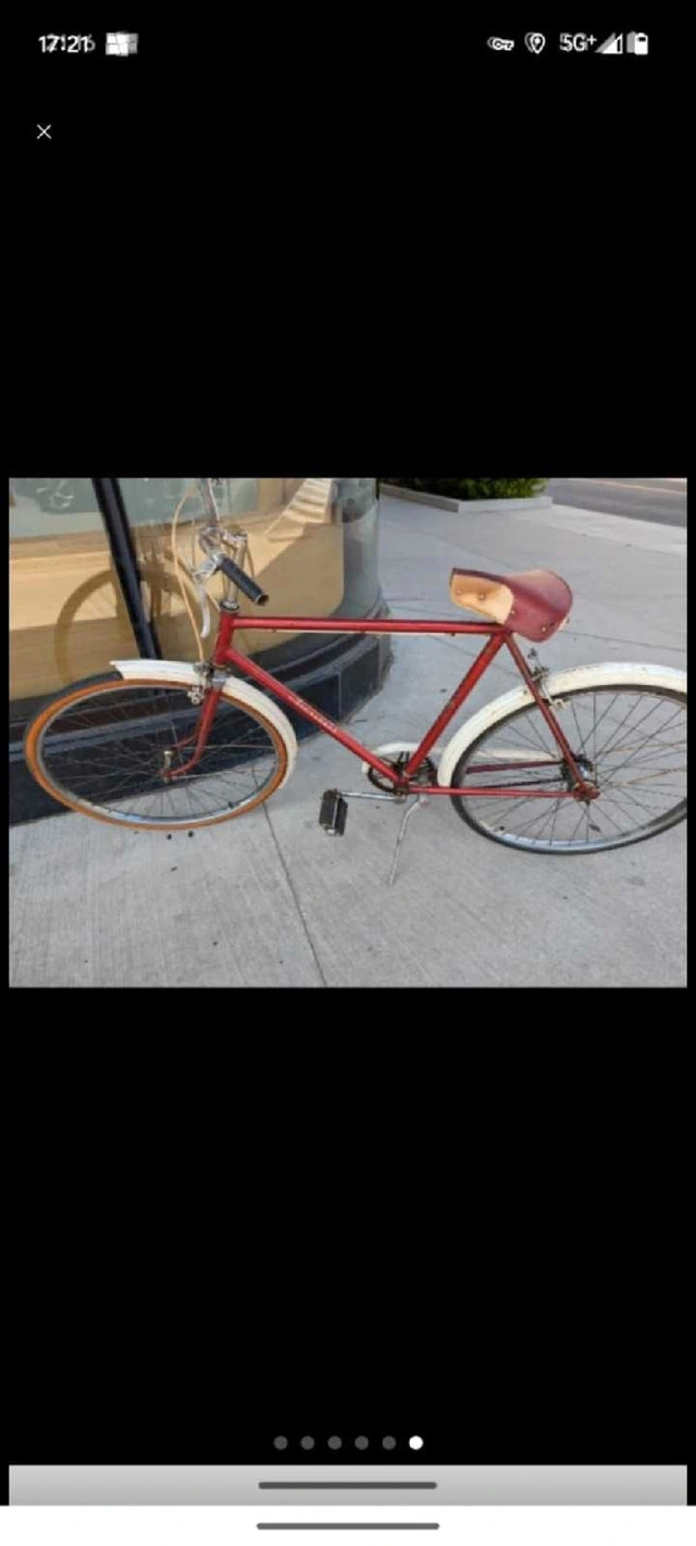 This is a used President bicycle with a red frame and white fenders, perfect for vintage cycling enthusiasts. Please note that the bicycle shows signs of wear consistent with its age. * Brand: President * Colour: Red * Frame: Steel * Fenders: If the ad's up, it's still up for grabs! Price Firm COLLECTORS WELCOME rides well