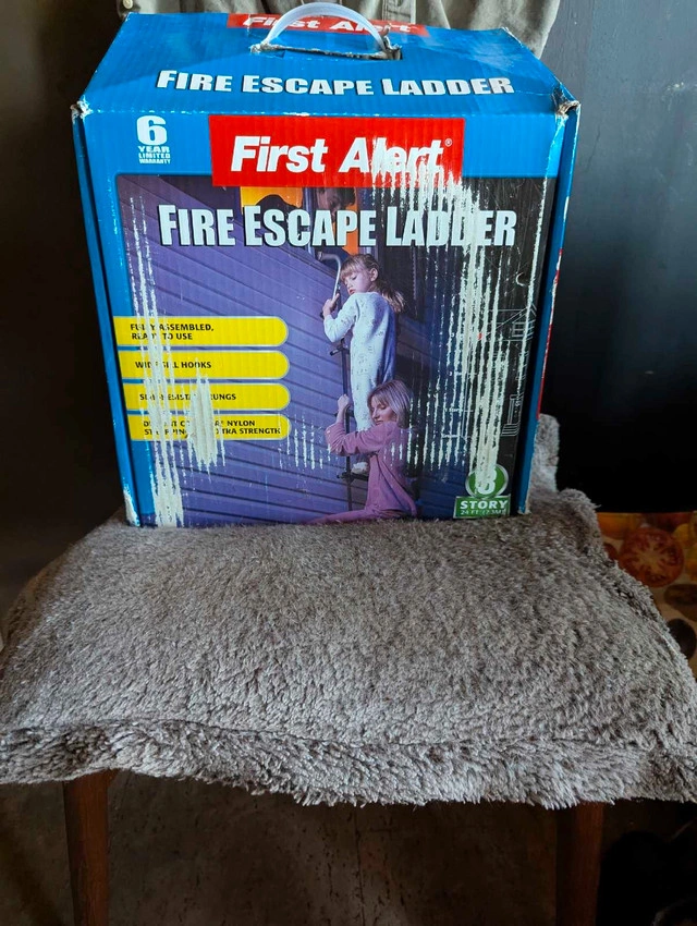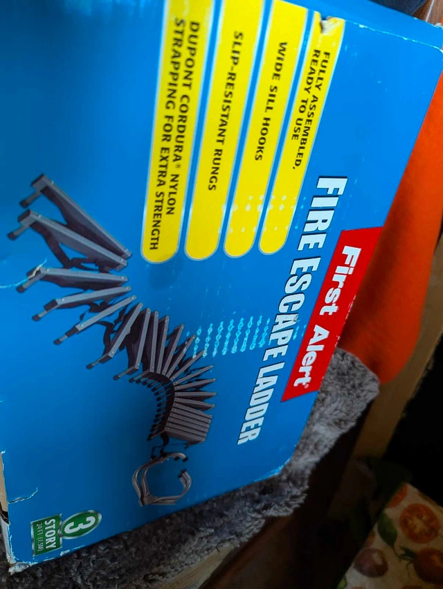 I'm offering a First Alert fire escape ladder, perfect for ensuring safety in a multi-story home. This 3-story ladder is designed for quick and easy deployment in case of a fire. It's been stored in the box and hasn't been used, but the box has some wear and tear from being moved around. The ladder itself is in great shape, ready to provide a secure escape route should you ever need it. This ladder is constructed with strong steel and durable nylon strapping. Key features include: * Fully assembled and ready to use * Wide sill hooks for secure attachment * Anti-slip rungs * Strong steel construction * Compact design for easy storage. If the ad is up, the ladder is available! Don't wait until it's too late—safety first, friends!