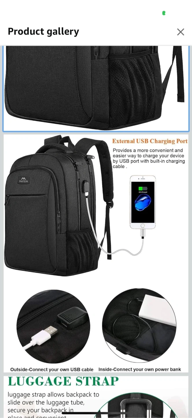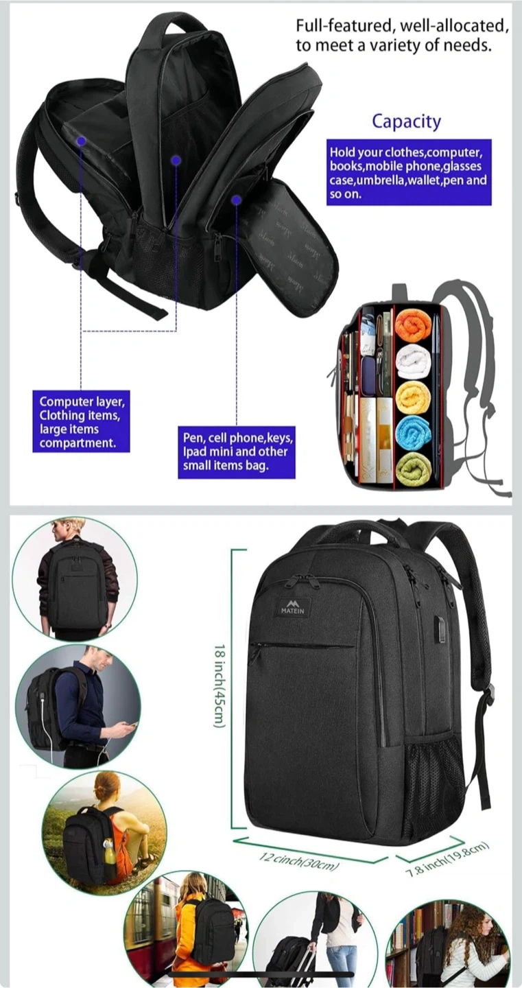 Looking to sell my MATEIN laptop backpack in black! It's in great shape and super handy for carrying your laptop, books, and other essentials. It's got lots of well-allocated compartments to keep everything organized, including a computer layer, clothing items compartment, and smaller pockets for pens, phones, and keys. Plus, it has an external USB charging port so you can easily charge your devices on the go! The dimensions are 18 inches (45cm) x 12 inches (30cm) x 7.8 inches (19.8cm).