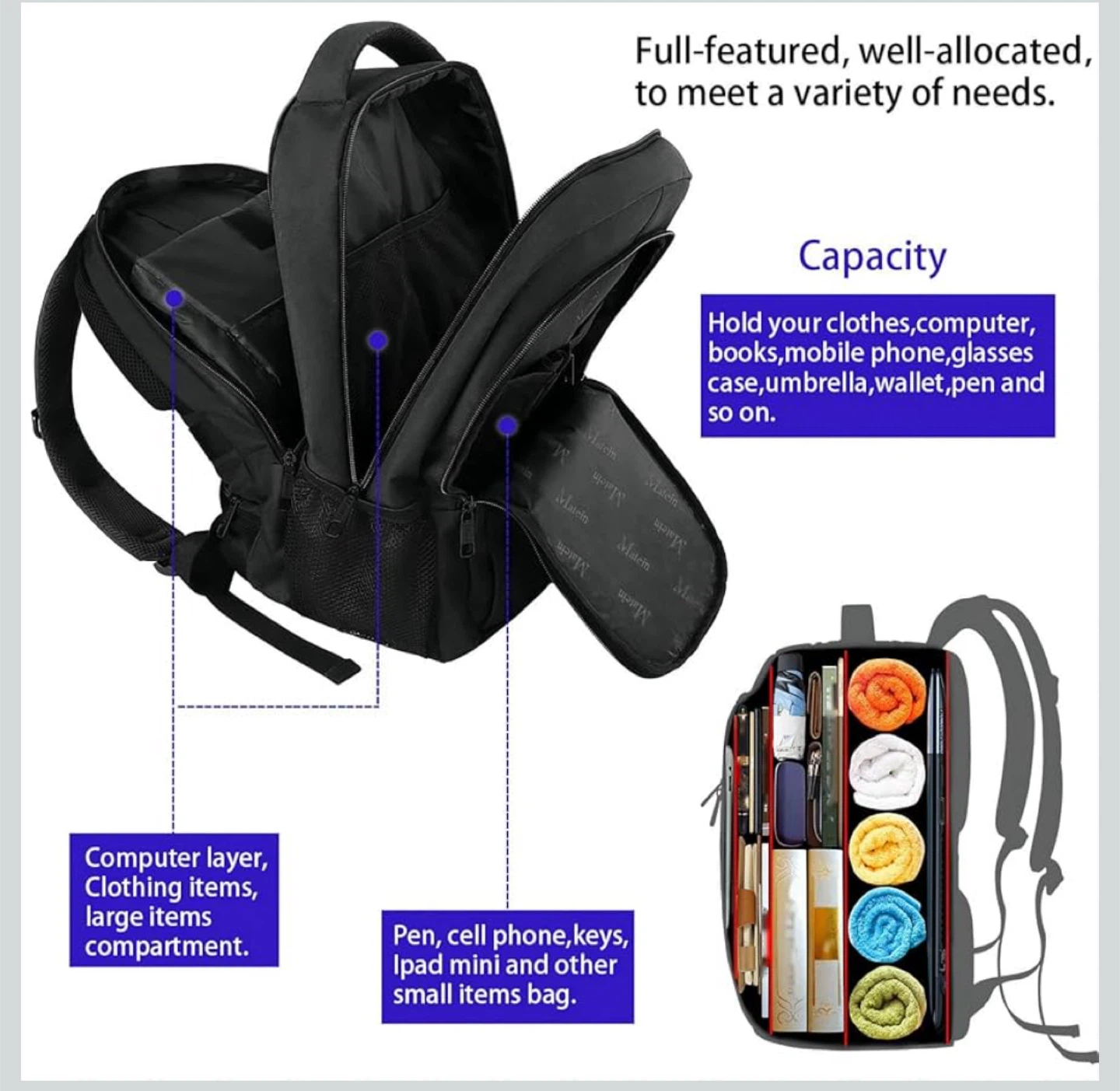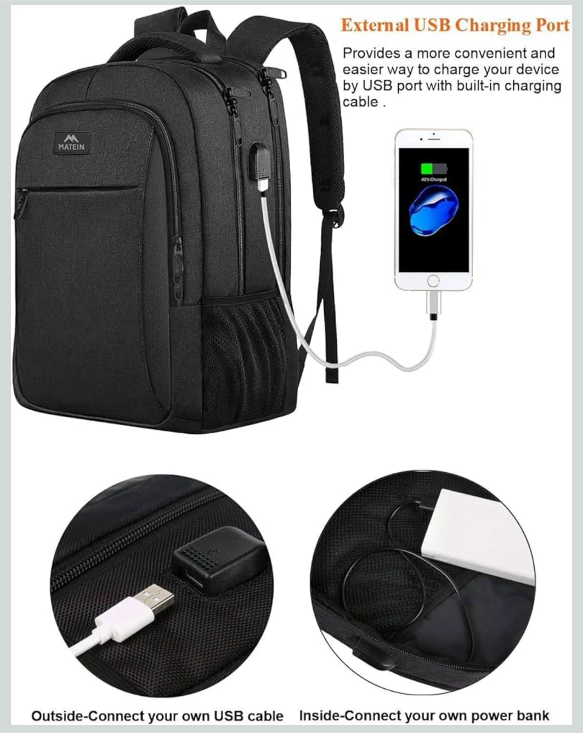MATEIN Black Laptop Backpack with USB Port