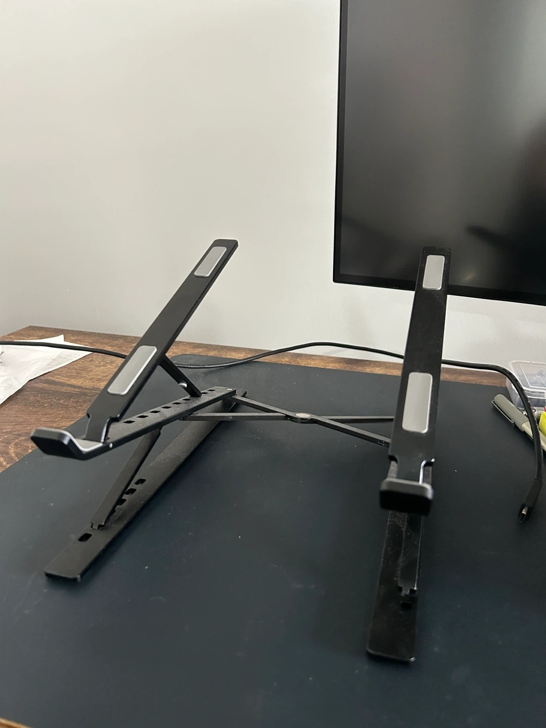 Selling an adjustable laptop stand in great condition made from aluminum! It's perfect for improving your posture while working from home. Lightweight and portable, it easily folds up for storage or travel and comes with bag.