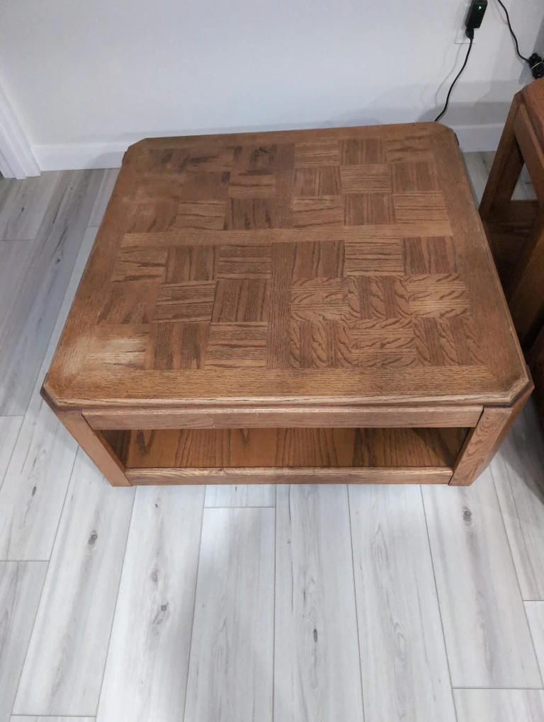 Selling a wooden coffee table with a built-in shelf! It's perfect for storing books or magazines. The table has a lovely, natural wood finish that would complement any living room. It's in great condition and ready for a new home!