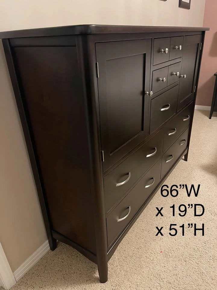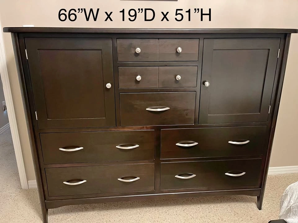 Excellent condition solid wood Canadian made dresser with drawers and cabinets. 66"W x 19"D x 51"H.