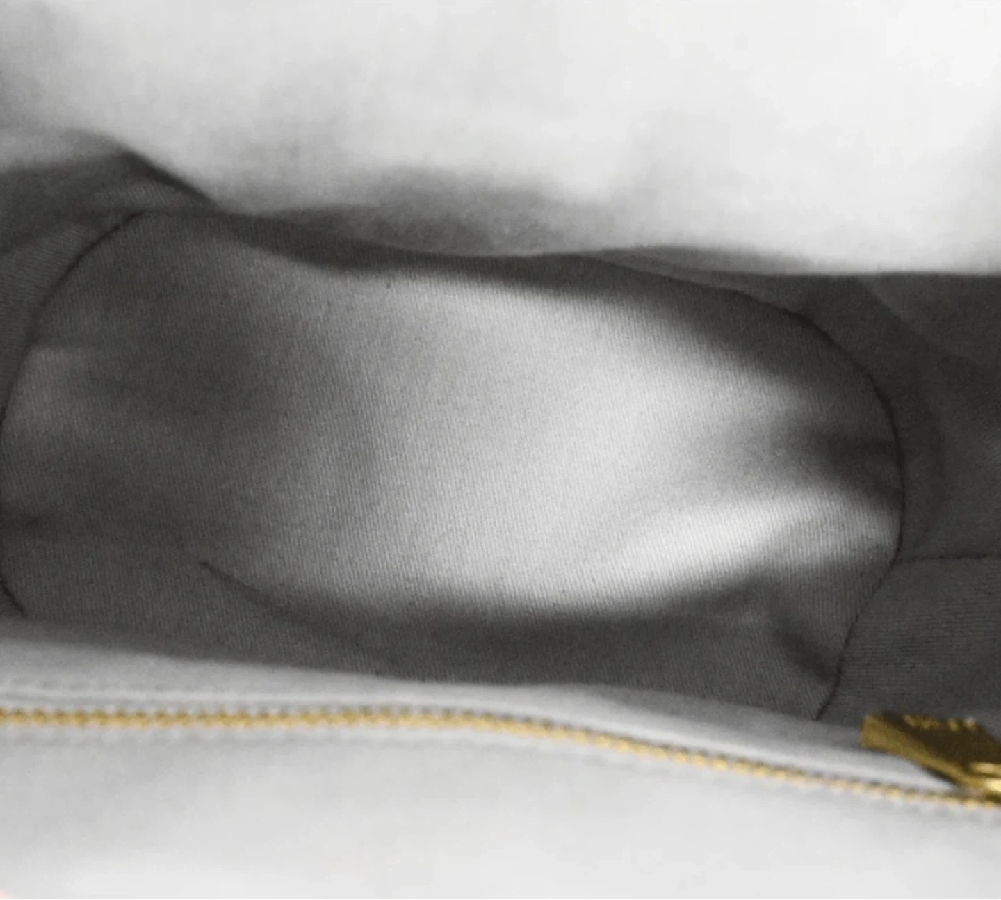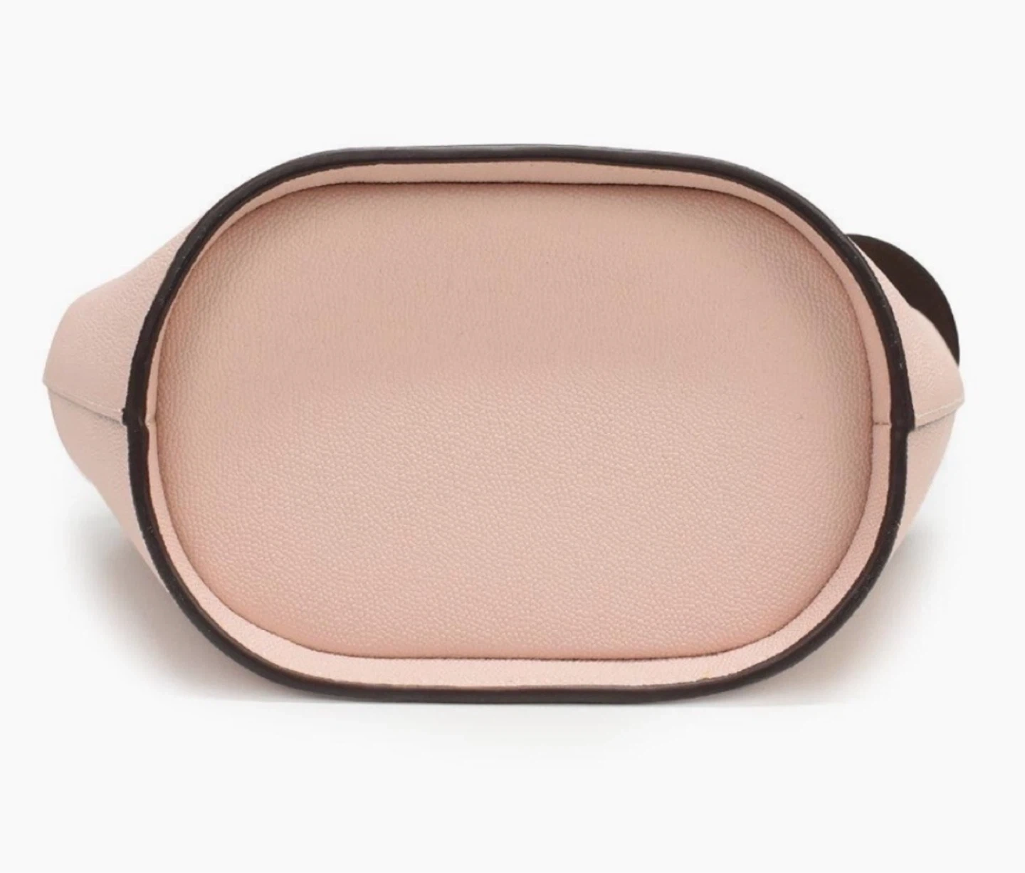 Light pink pebbled leather with a wide brown leather handle and oversized gold hardware. Features a magnetic closure and light grey fabric lining. Does not include crossbody strap.