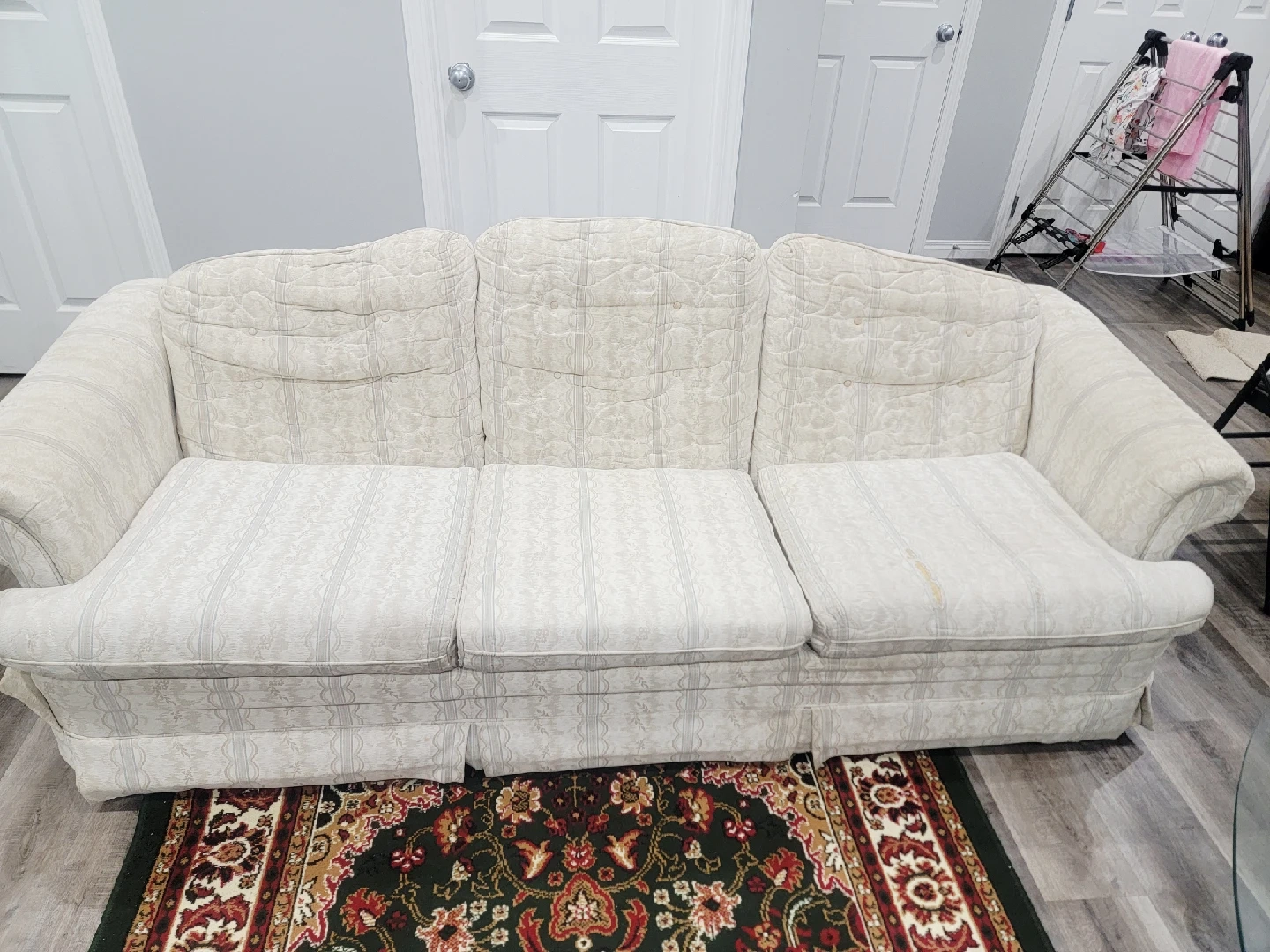Selling a comfy beige sofa. It's perfect for a living room or den area. It shows some signs of use, but it's still in good condition for relaxing and enjoying your favourite shows or having a nap!