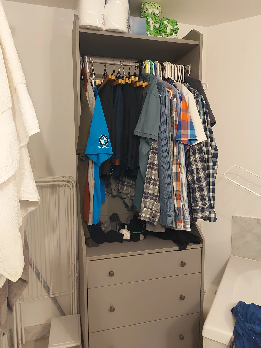 Selling a grey IKEA Hauga dresser with 3 drawers and top clothing rod. It's in good condition and perfect for adding storage to any room.