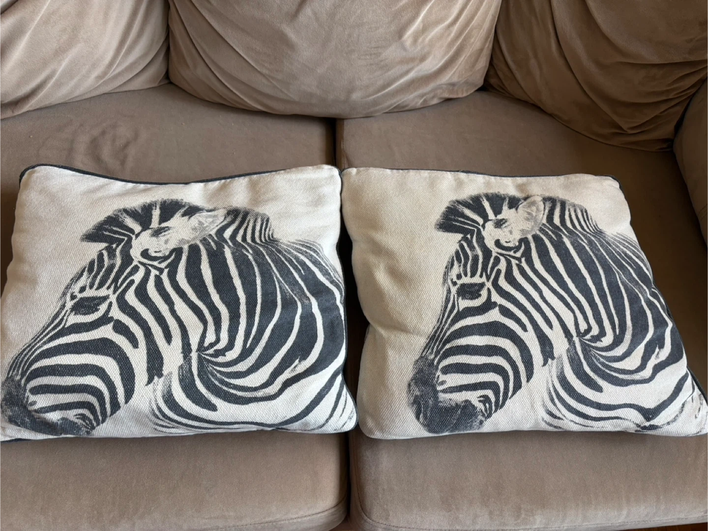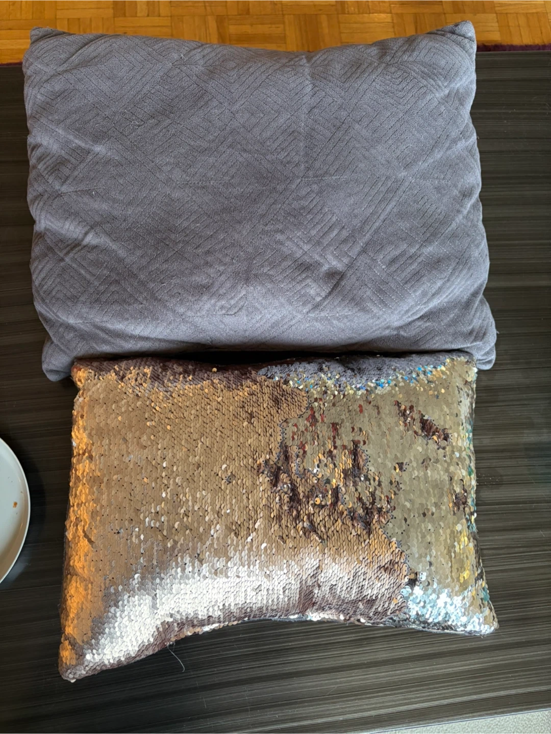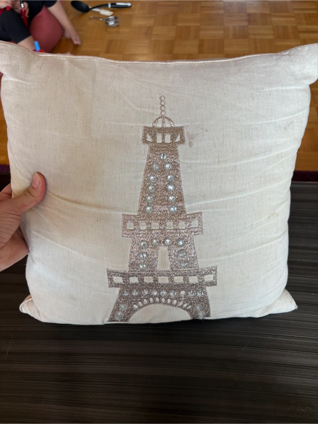 Selling a few decorative cushion! One has an Eiffel Tower design with some sparkly accents, and there's a pair with zebra prints. Also have a grey quilted pillow and a sparkly gold sequin pillow.