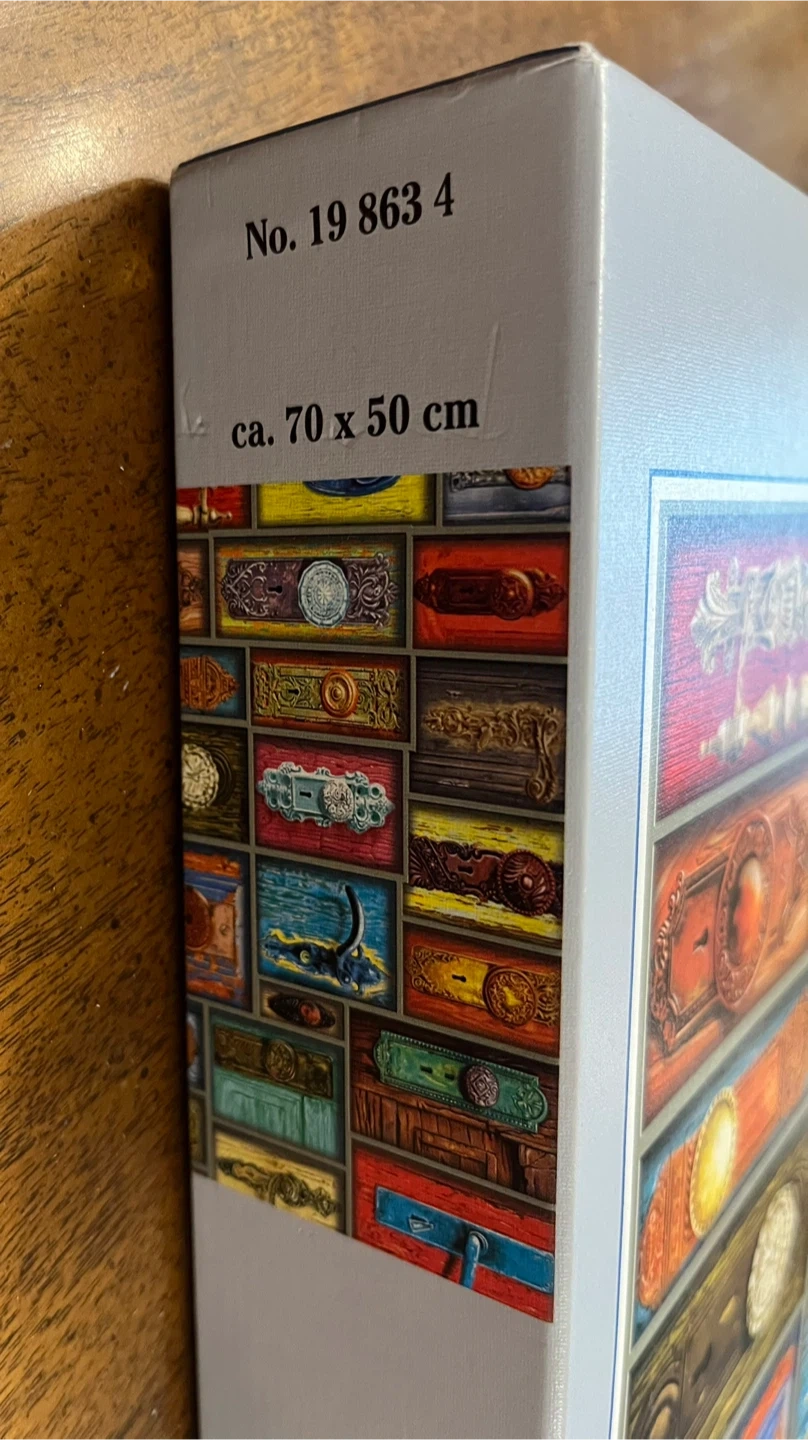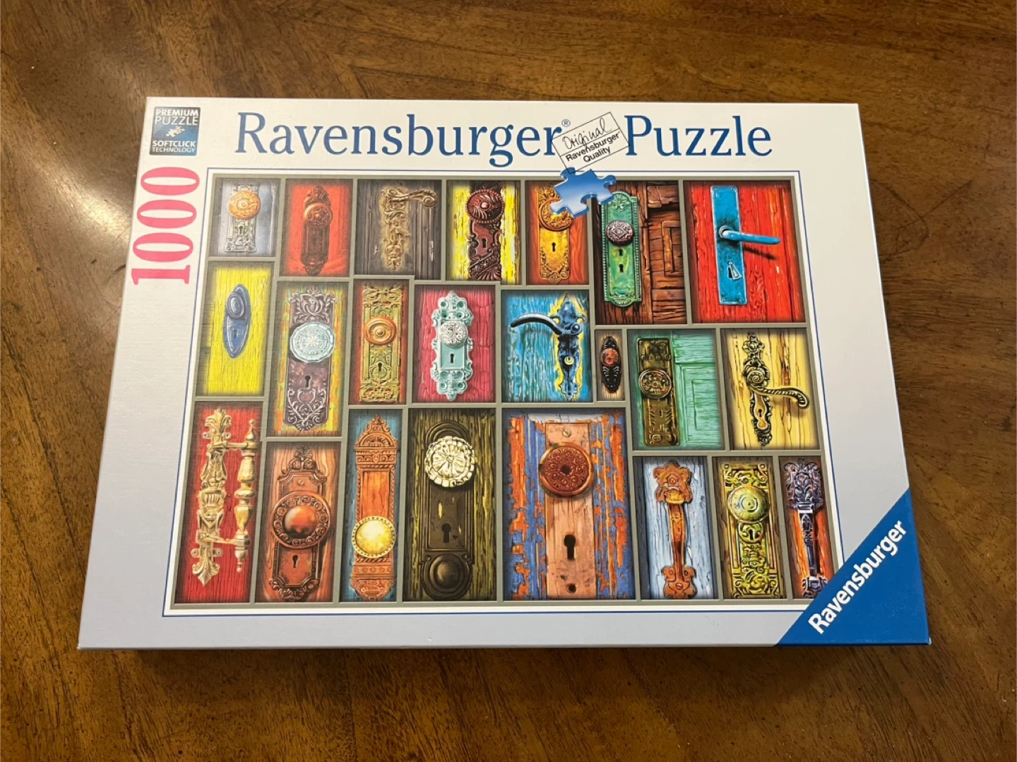 Ravensburger 1000 piece puzzle featuring a variety of antique doorknobs. The puzzle measures approximately 70 x 50 cm when completed.