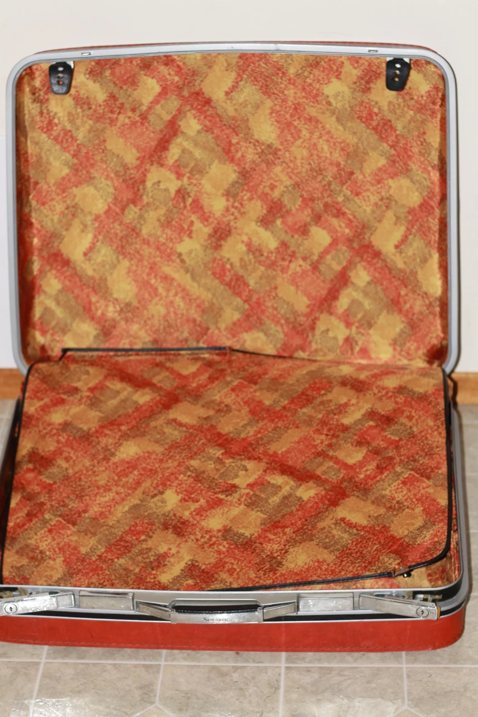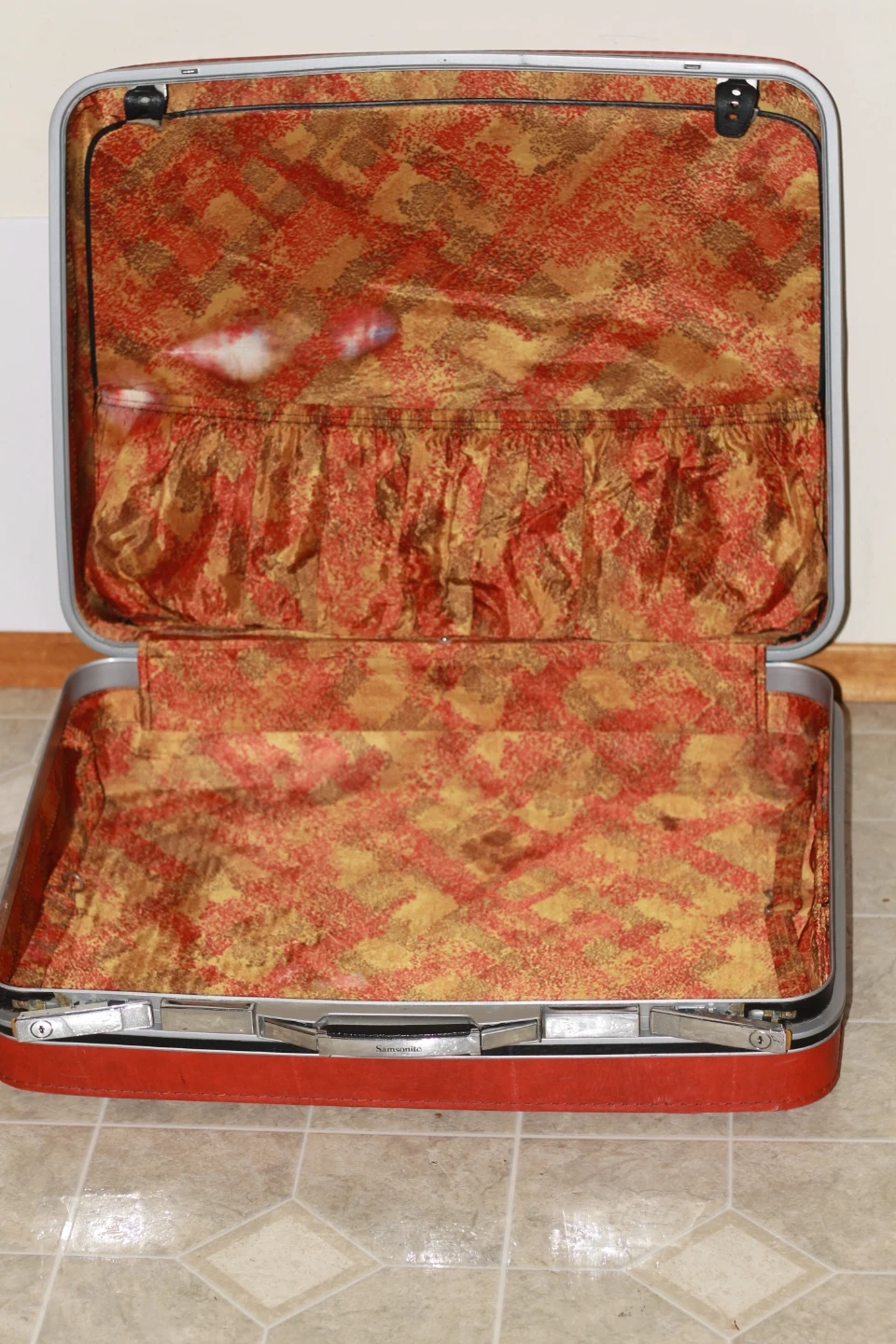 Classic red Samsonite suitcase with a patterned interior. It's a durable option for travel. This would be useful for someone looking for vintage luggage.
