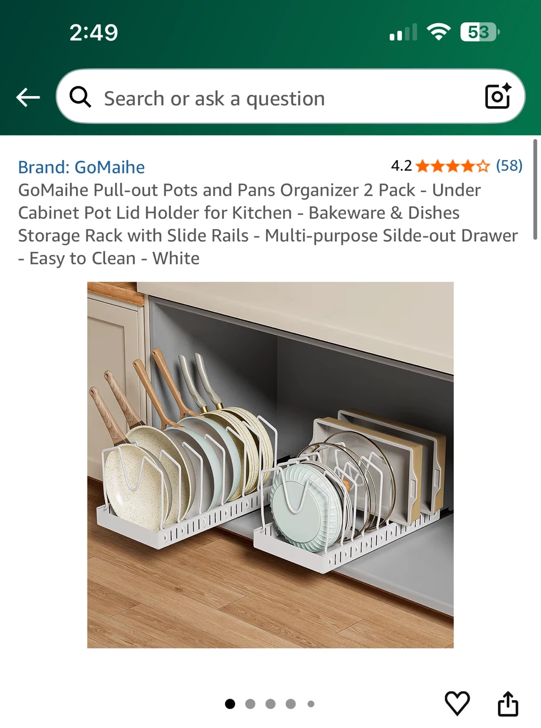 1000+I'm selling a GoMaihe pull-out pots and pans organizer in white! It's a 2-pack under cabinet pot lid holder for the kitchen. It's great for bakeware and dishes, and is a storage rack with slide rails. It's multi-purpose and easy to clean It’s brand new in box unopened