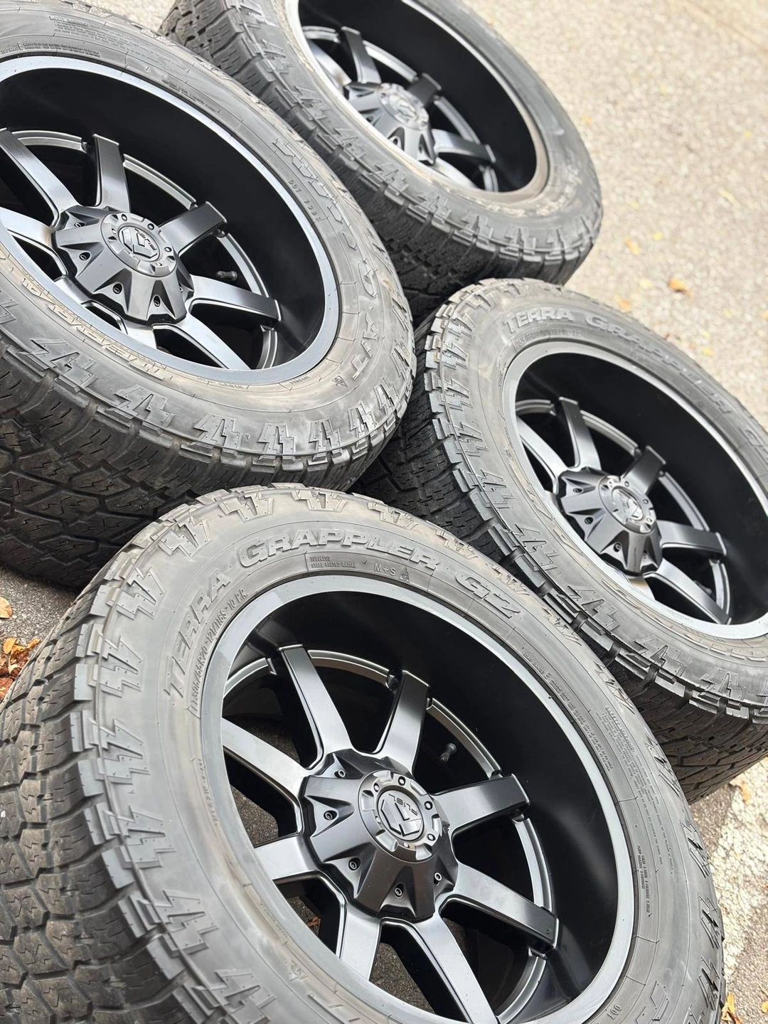 Set of Four Authentic BRAND NEW 20 inch FUEL MAVERCIK Wheels with used LT 305 55 R20 Nitto Terra Grappler G2 All Terrain mounted and balanced on them