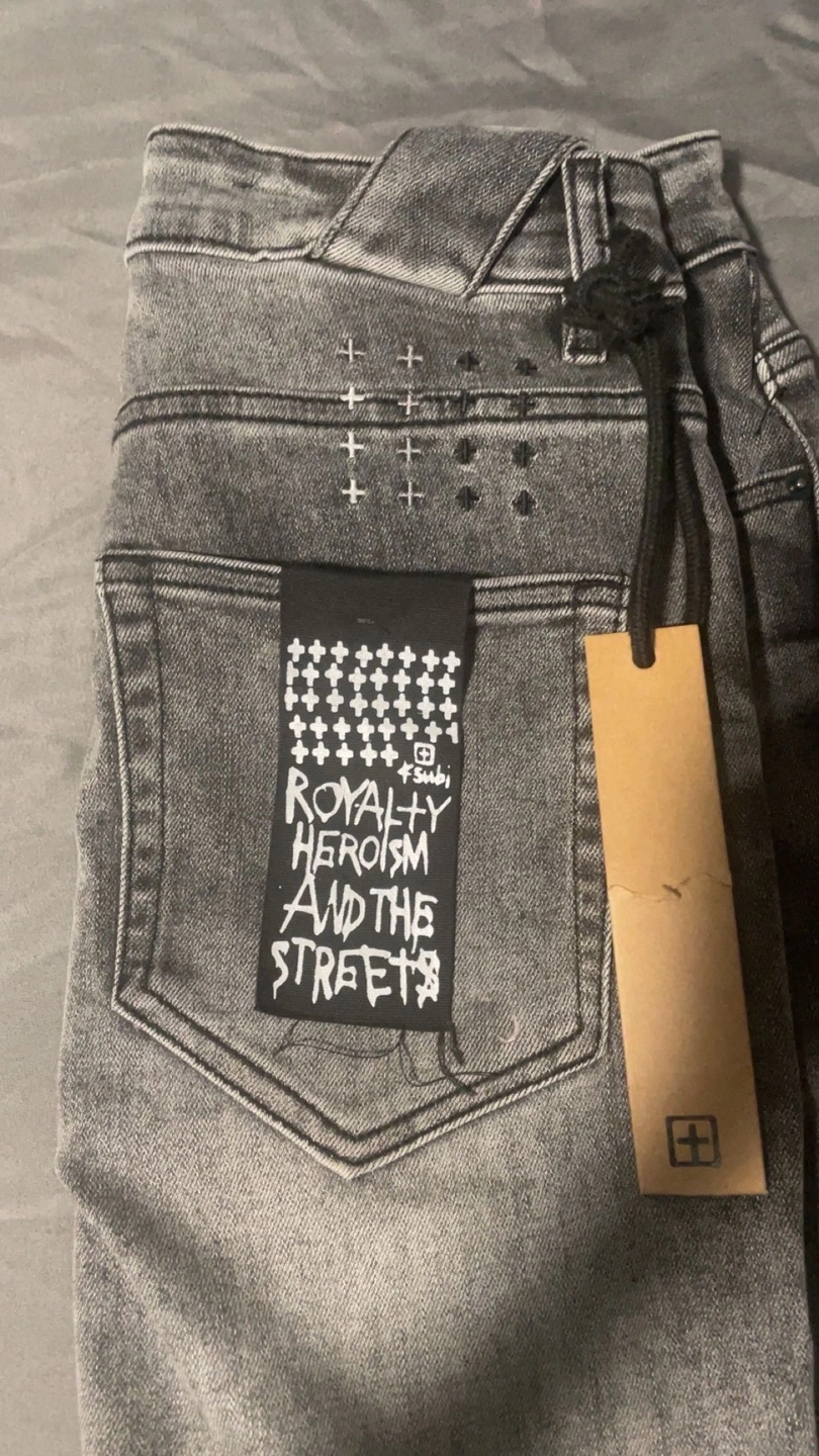 Selling a pair of Ksubi jeans in a grey, distressed wash. They feature unique design details and are in great condition. Perfect for adding an edgy touch to your wardrobe!